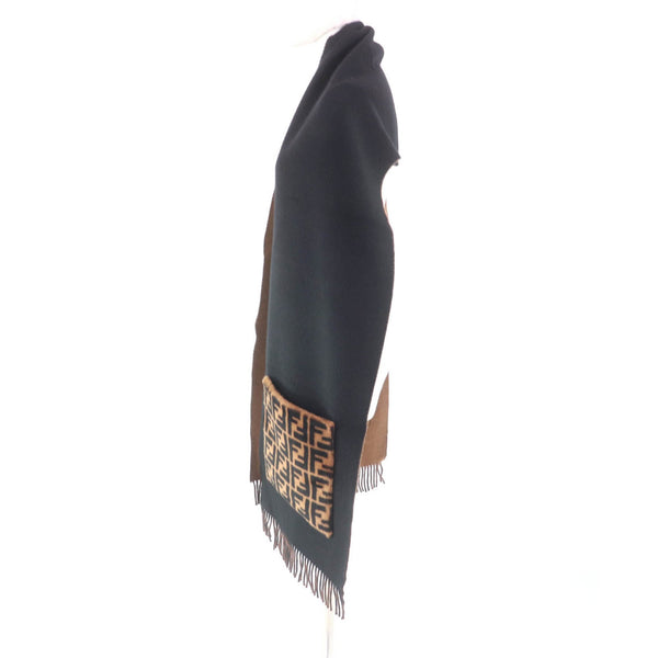 FENDI FXT252 Cashmere Blend Zucca Print Scarf with Fur Pocket and Fringe, Black/Brown, Includes Dust Bag, Made in Italy, Women\'s