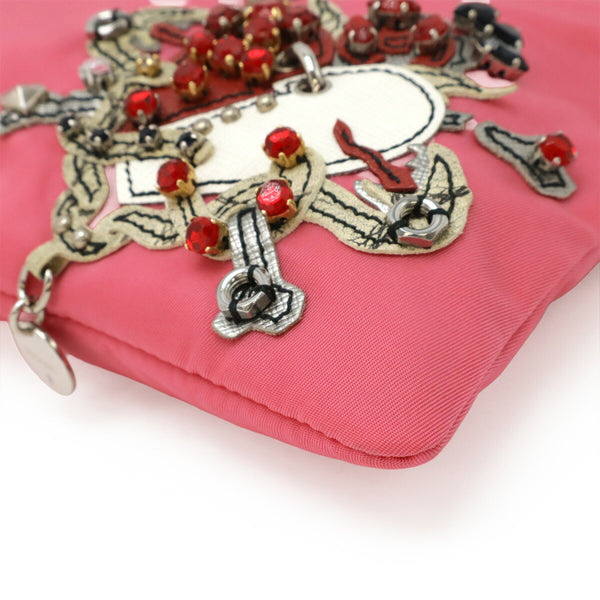 Prada Tessuto Tattoo Pouch Handbag - Heart Motif Nylon with Beads, PEONIA Pink, 1N1588