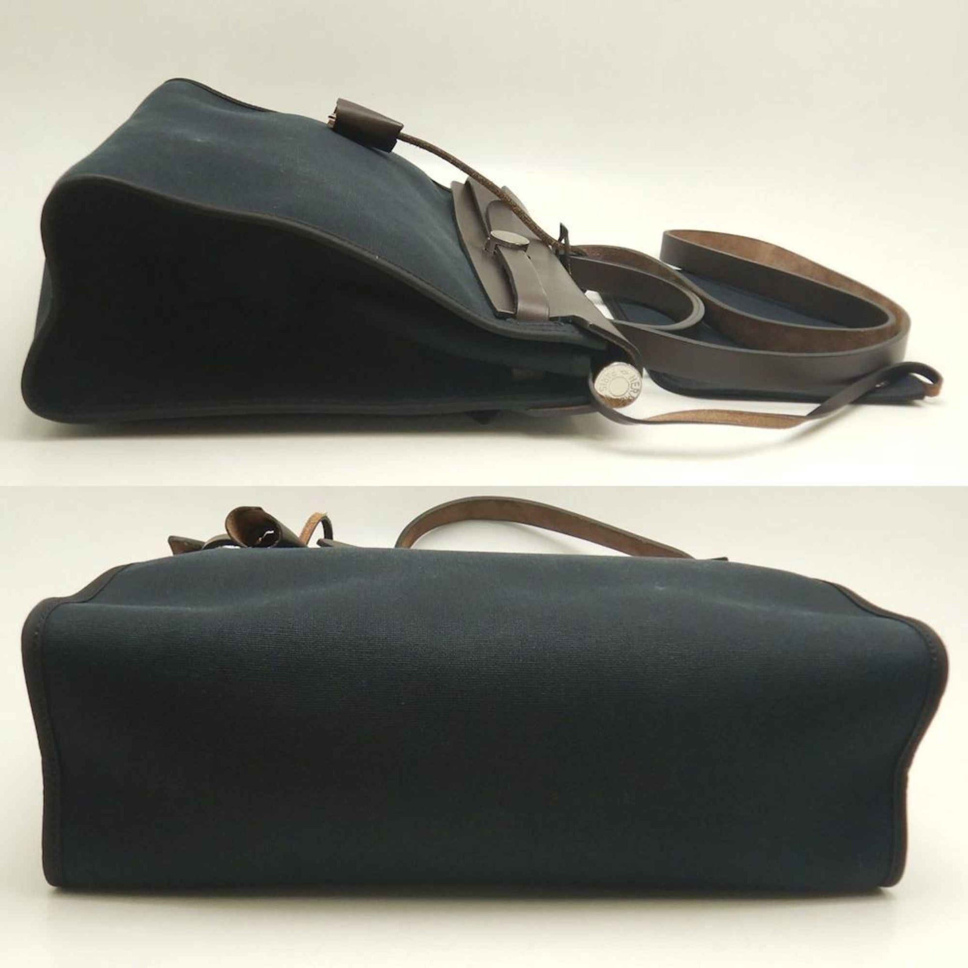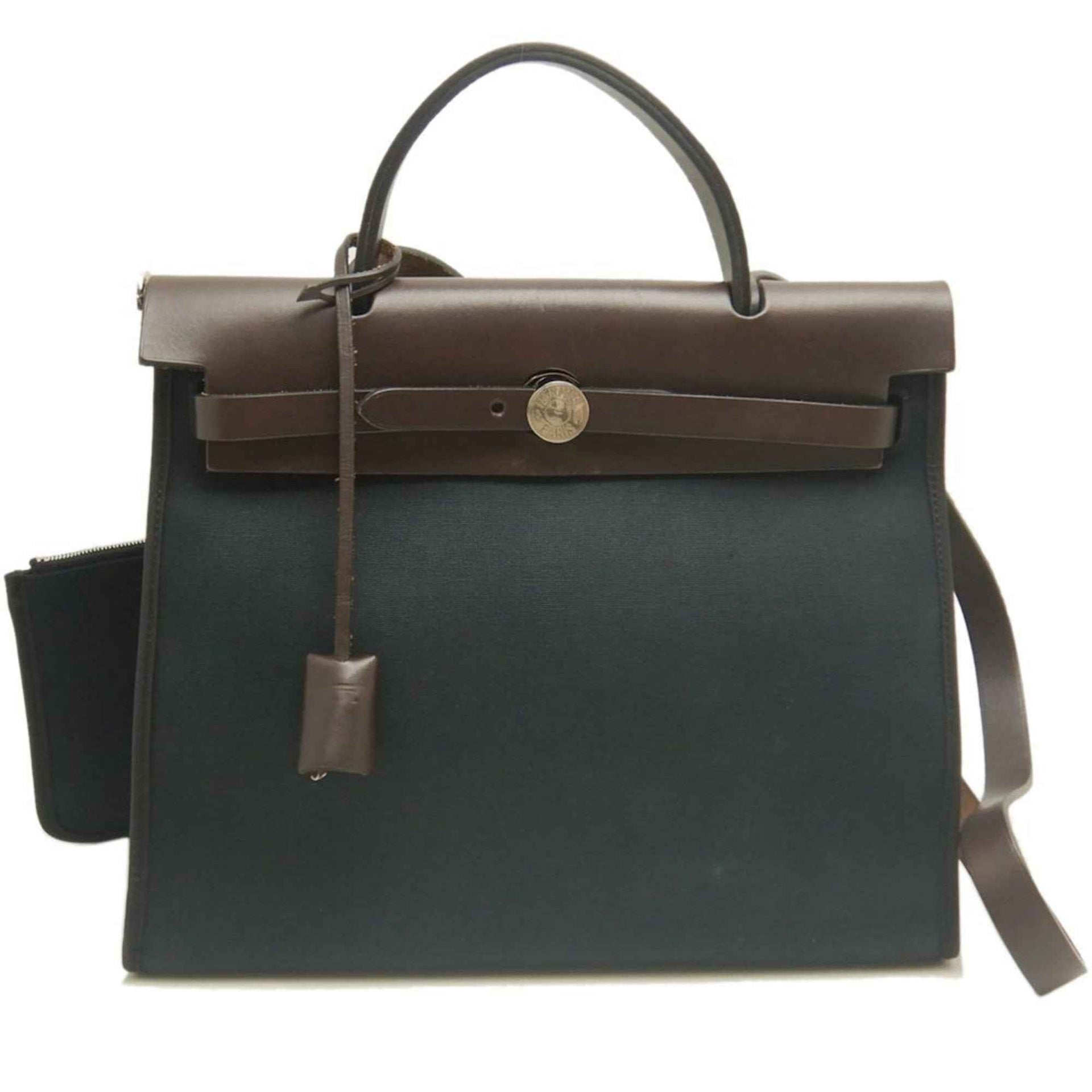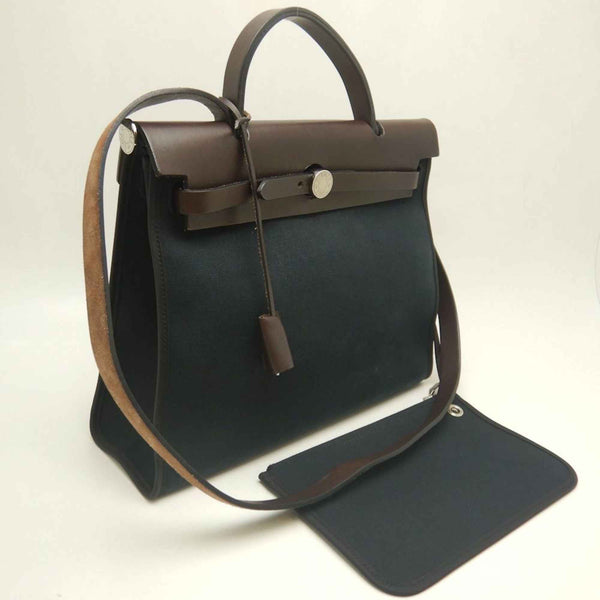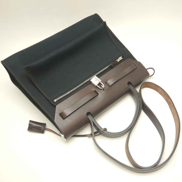 HERMES Airbag Zip PM Handbag, Toile Militaire, Vache Hunter, Cotton Canvas and Leather, Black Brown, Women\'s, 253246