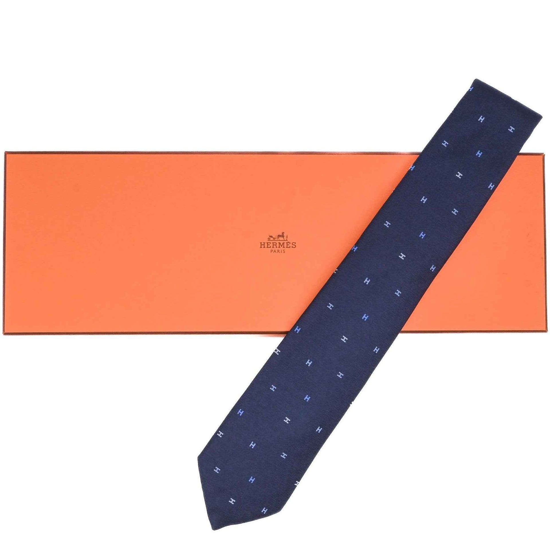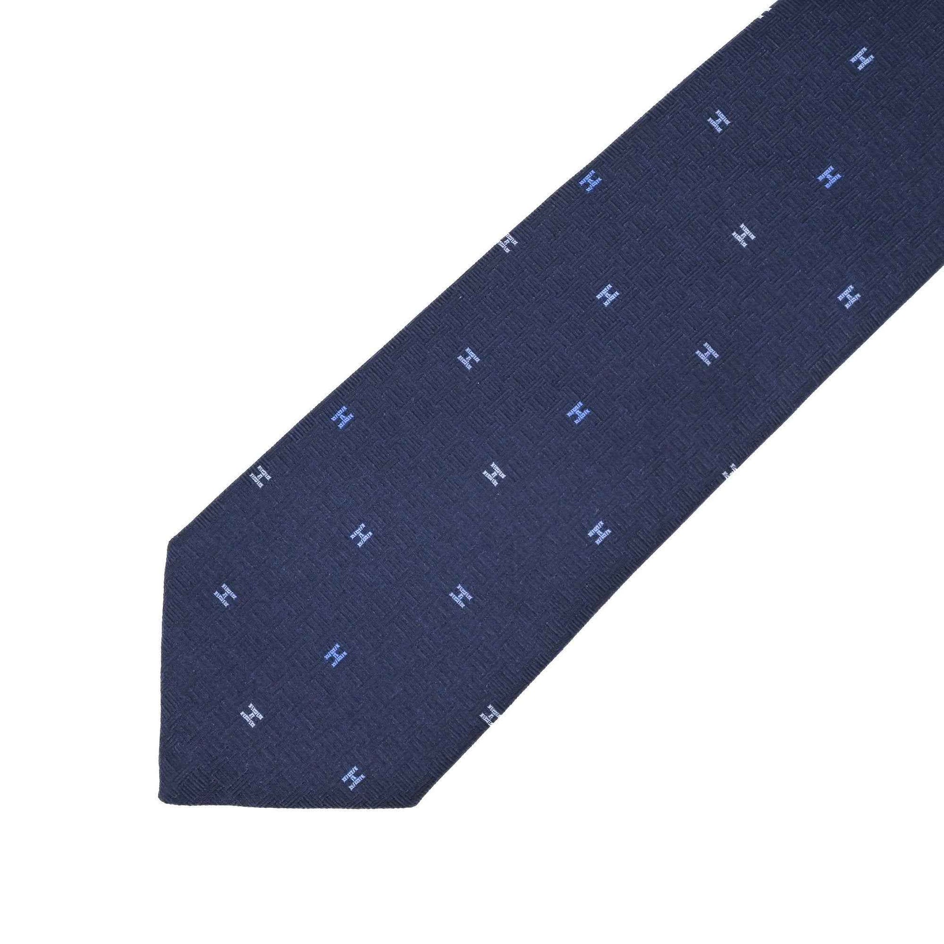 HERMES H Tie, Navy Blue, 100% Silk, Men\'s