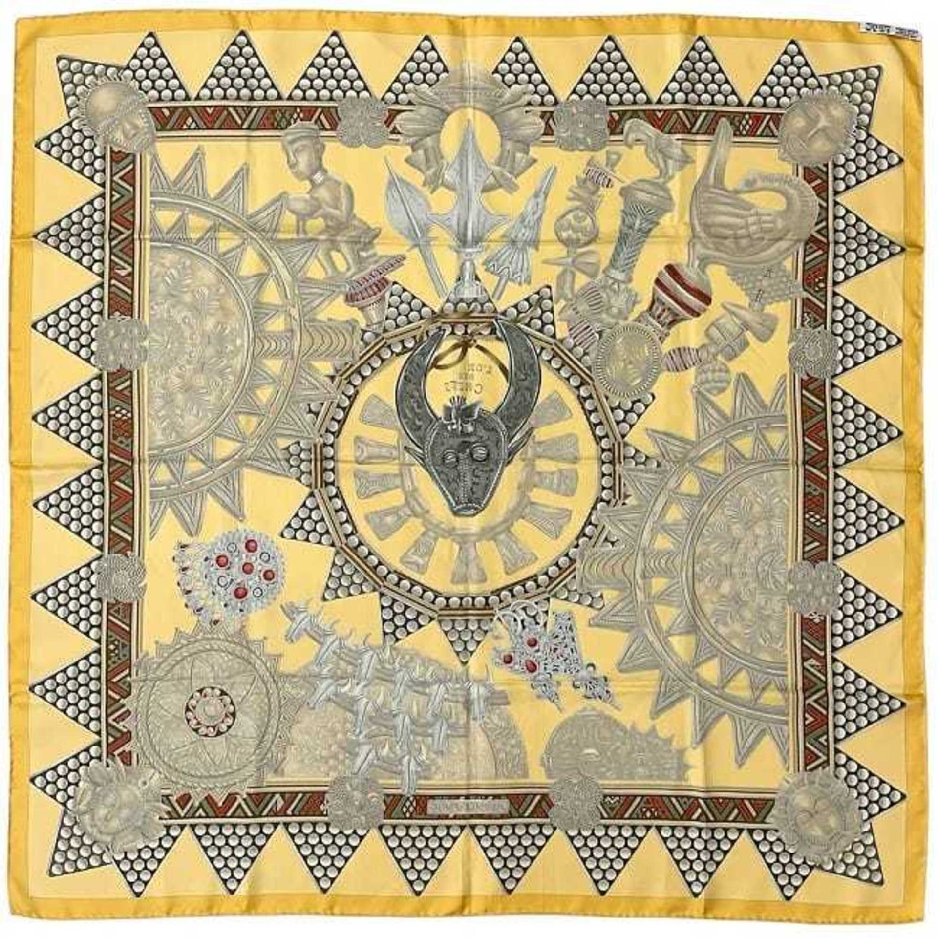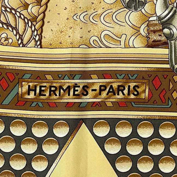 Hermes Hermès Carré 90 Scarf (ec-23771) in Beige and Brown. Made of 100% Silk, \"L\'OR DES CHEFS\" (The Chiefs\' Gold). A large, ethnic scarf from the collection.