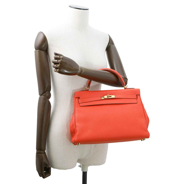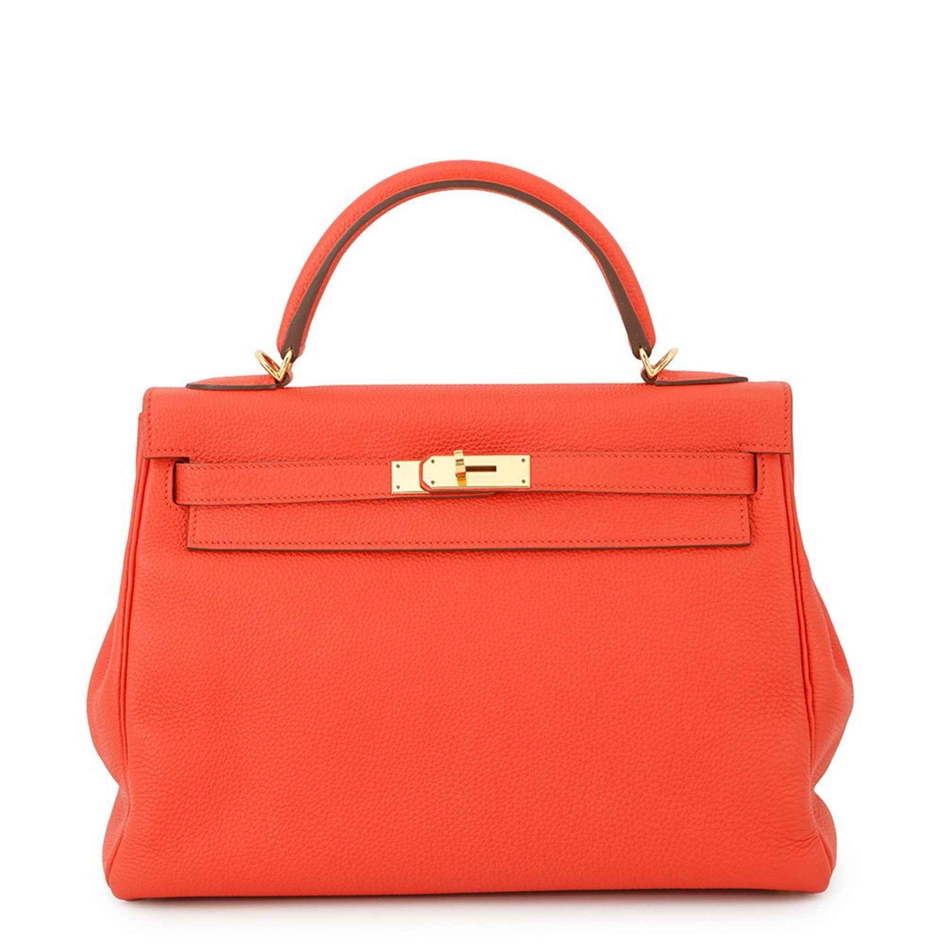 Hermes Hermès Kelly 32 handbag, inlaid with orange poppy and Taurillon Clemence leather, featuring a T-stamp 2-way shoulder strap.