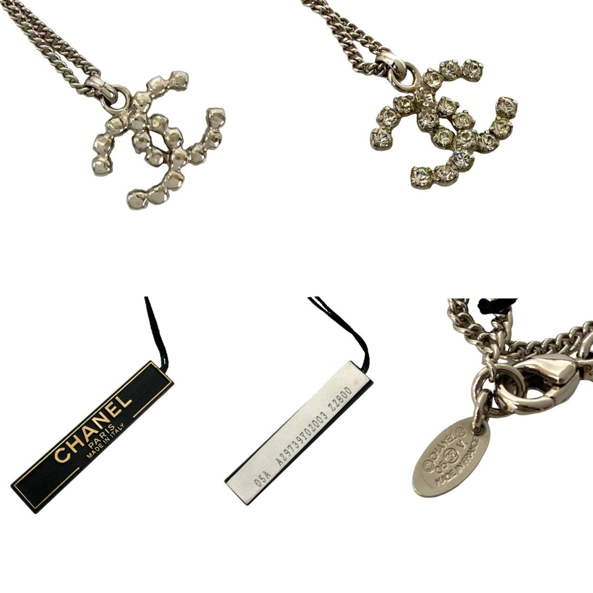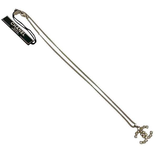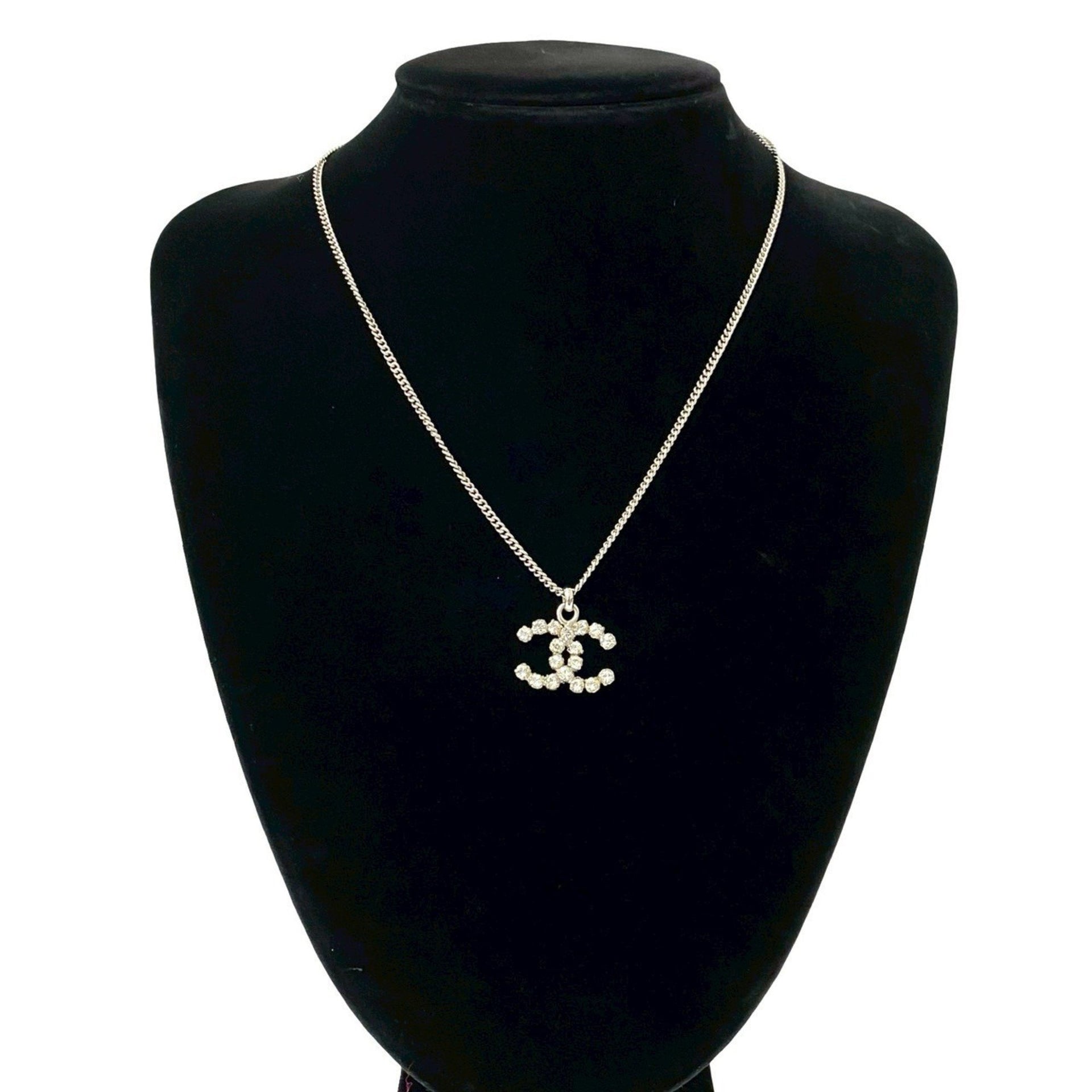 CHANEL Coco Mark Metal Rhinestone Necklace Pendant Silver 04982