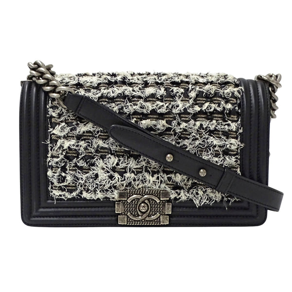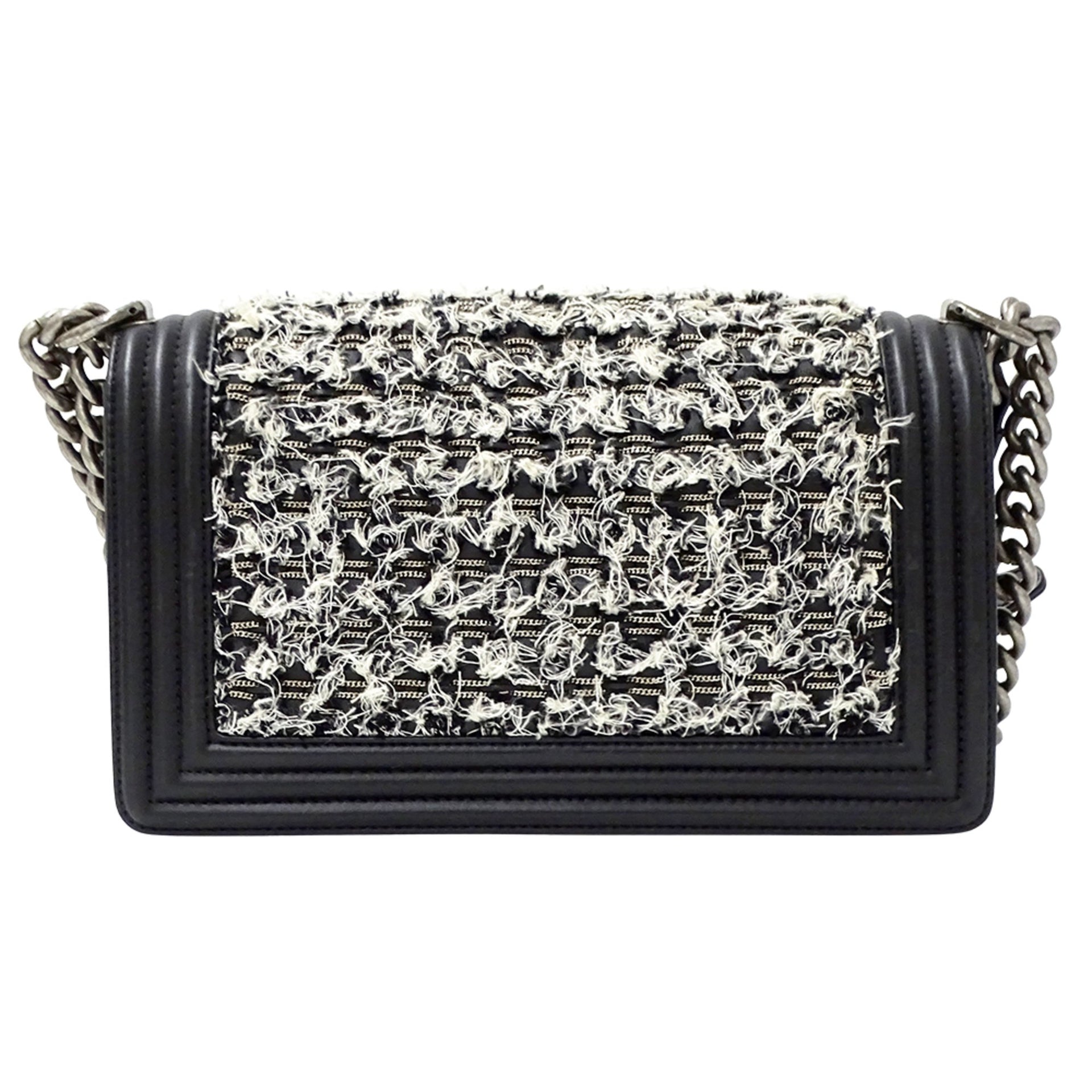 Chanel Boy Women\'s Shoulder Bag in Tweed Leather, Black and White, with Chain Strap