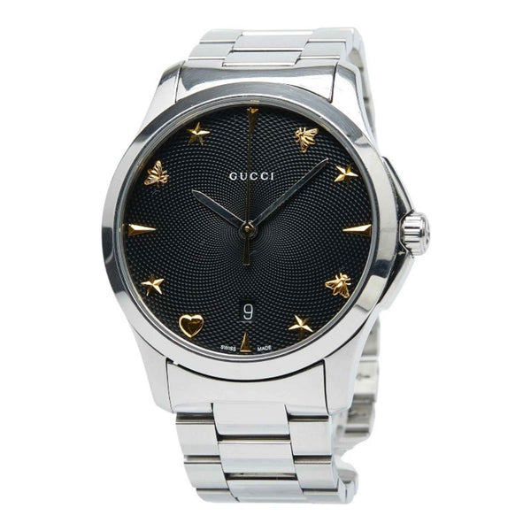 Gucci G-Timeless Watch with Star and Bee Motif, 126.4mm Quartz Movement, Black Dial, Stainless Steel, Men\'s