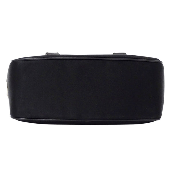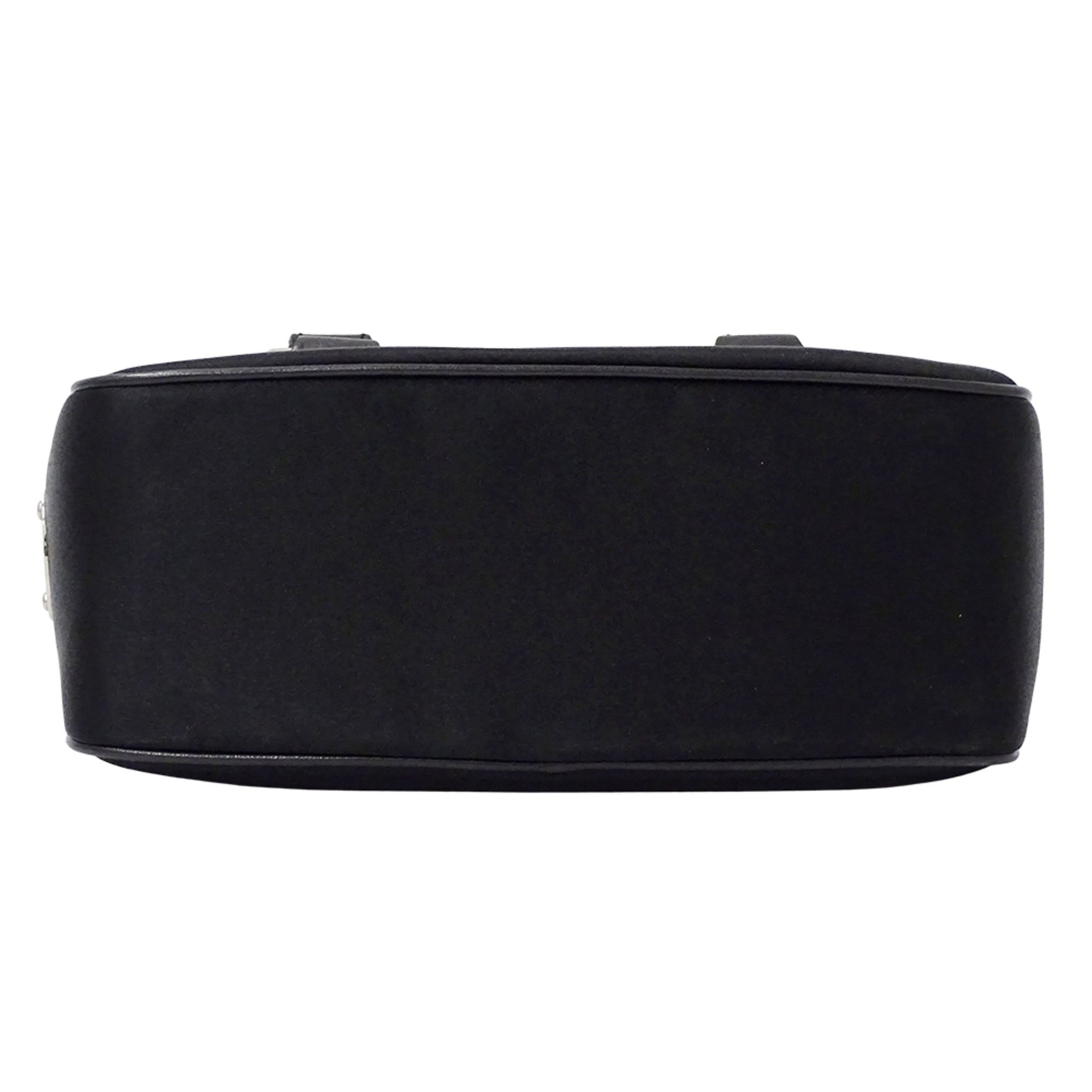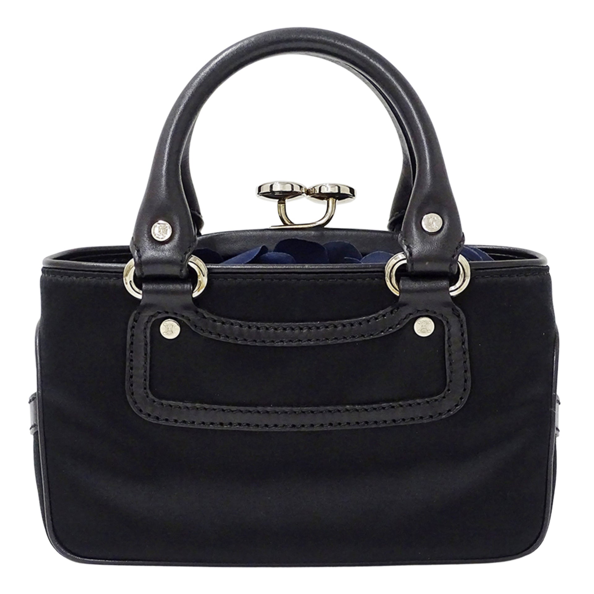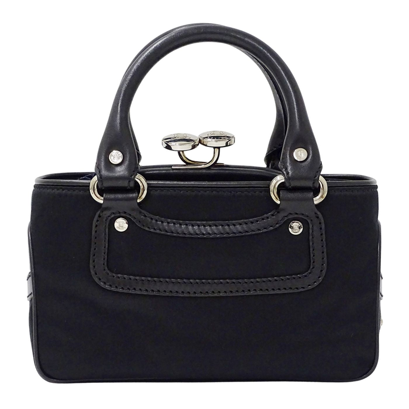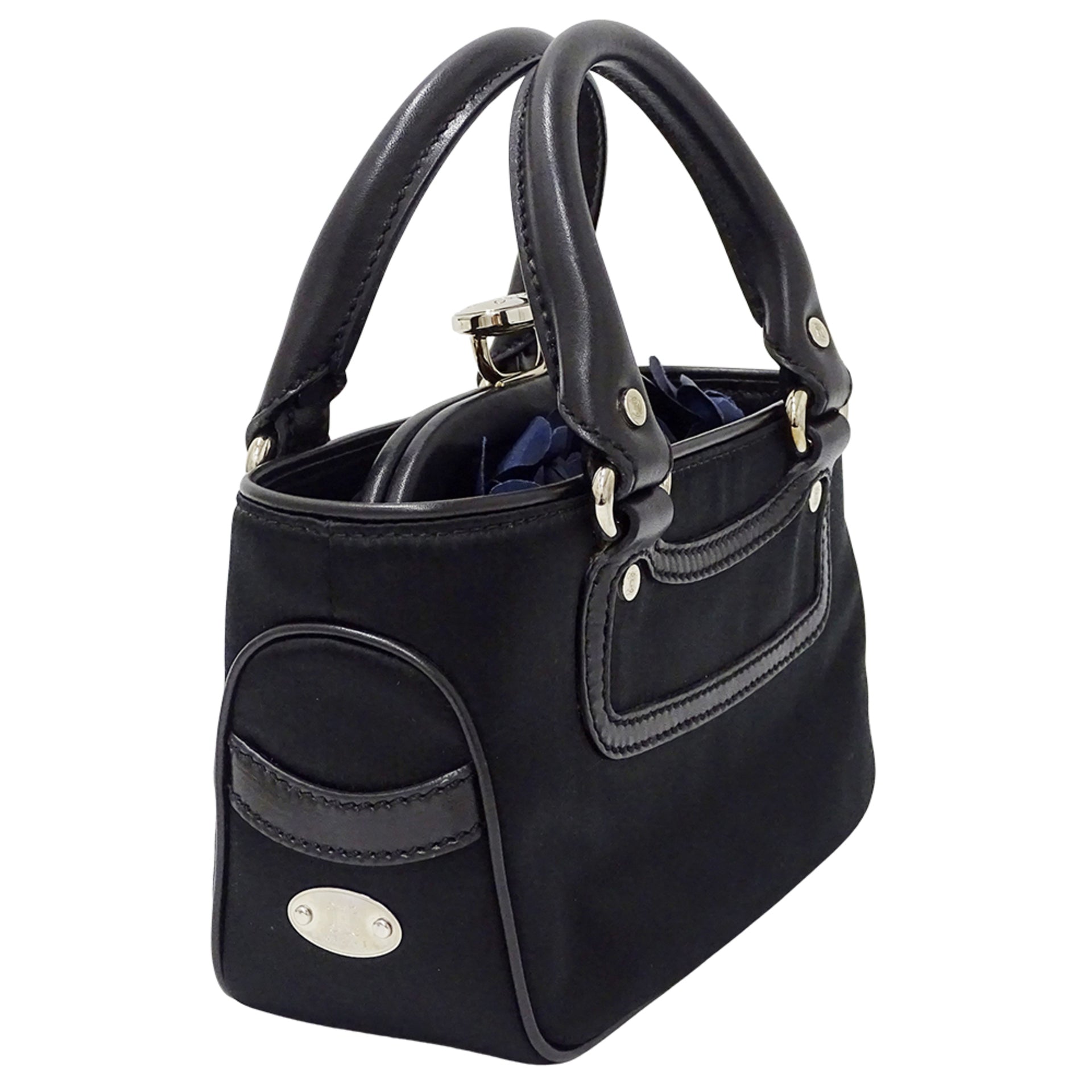 Celine Mini Boogie Bag, a women\'s designer handbag in black satin and leather with clasp pouch.