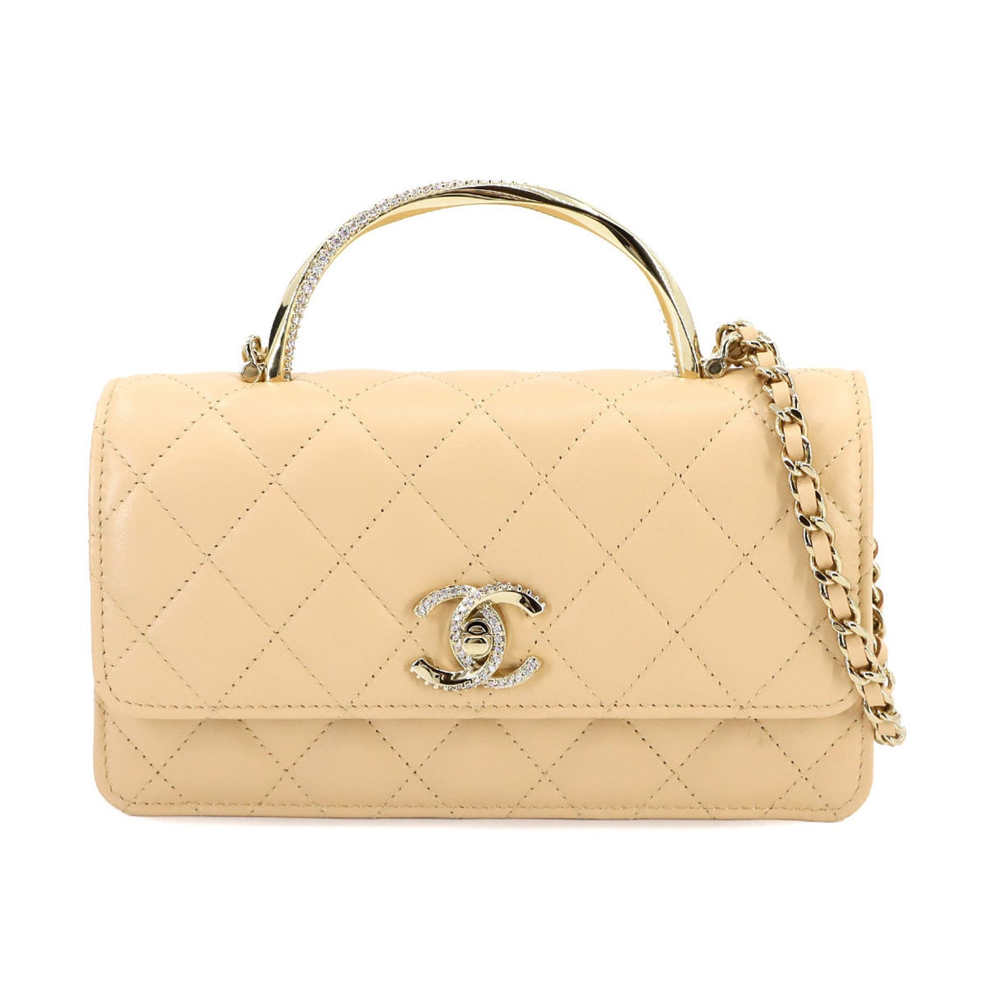 CHANEL Matelasse 2-way Hand Chain Wallet, Beige Lambskin, AP4293, Gold Hardware