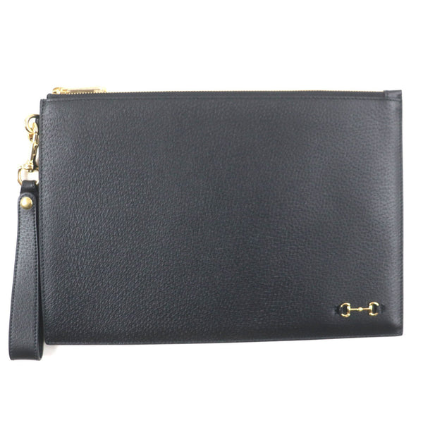 GUCCI 700524 Horsebit Leather Clutch Bag with Strap, Black Gold Hardware, Dust Bag, Made in Italy, Men\'s