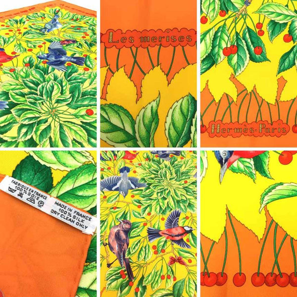 HERMES Hermes Scarf Muffler Carre 90 Les merises Cherries Bird 1993 Silk Orange x Yellow