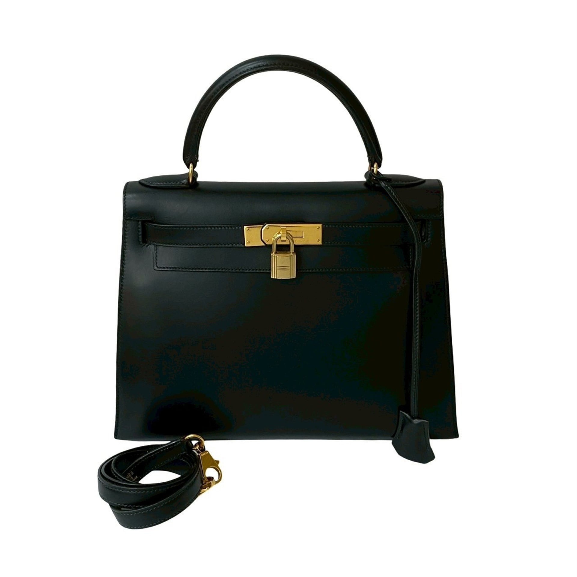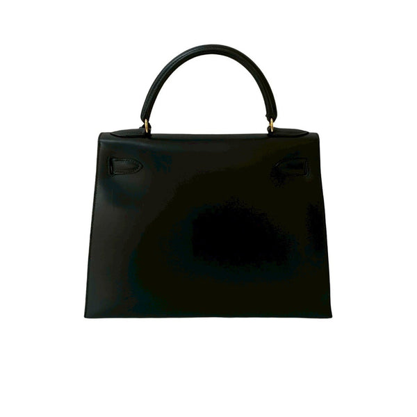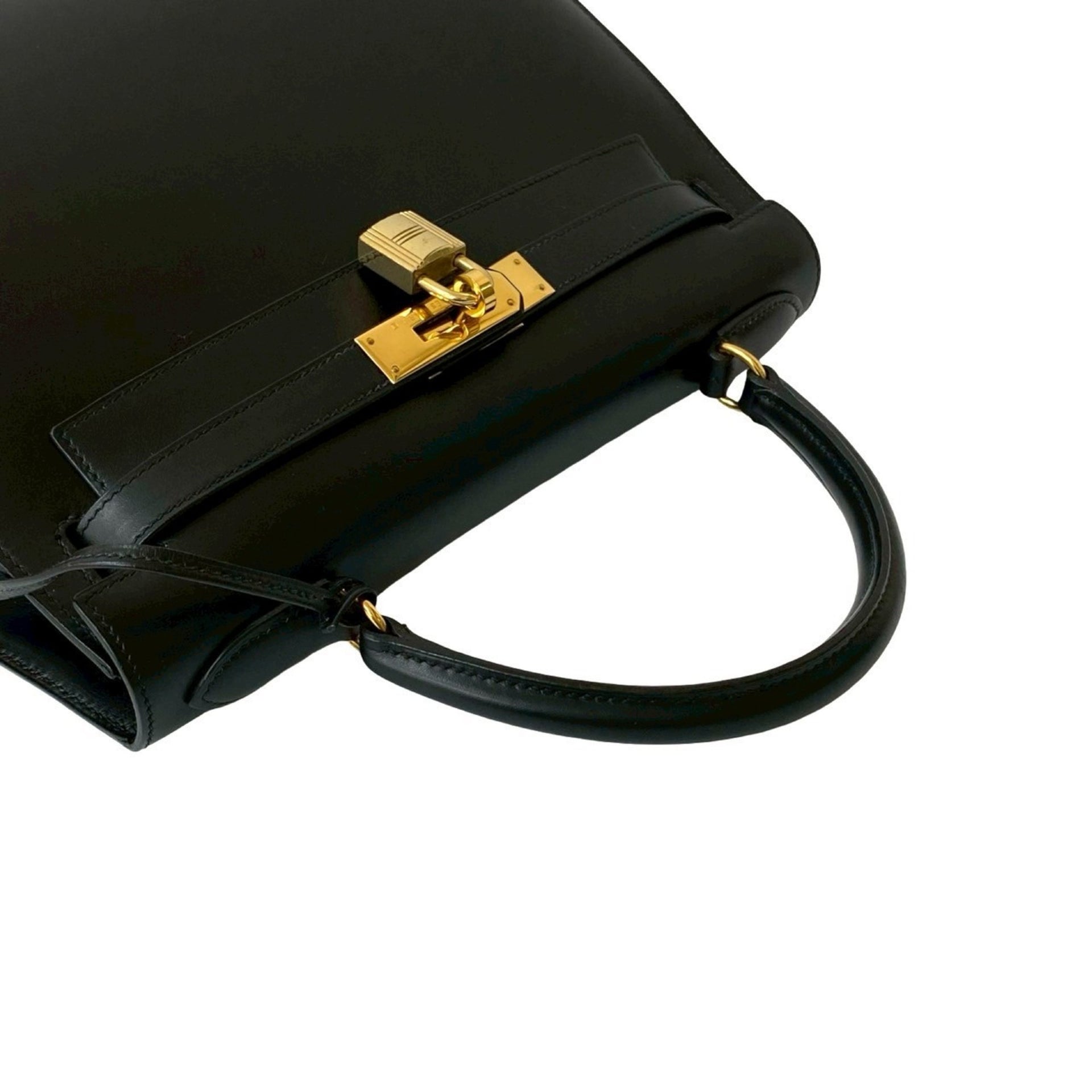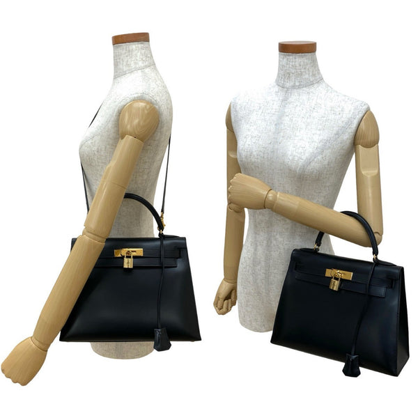 HERMES Kelly 28 Box Calf Leather Genuine 2-Way Handbag/Shoulder Bag Black 15582