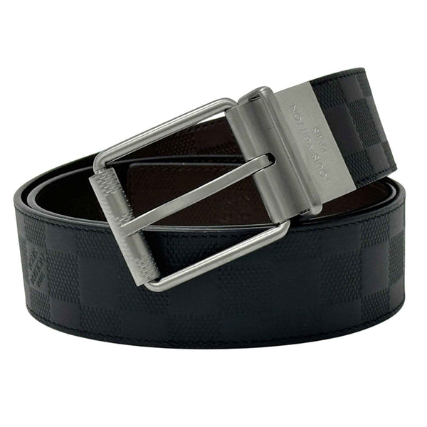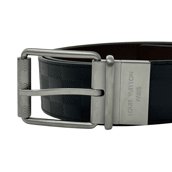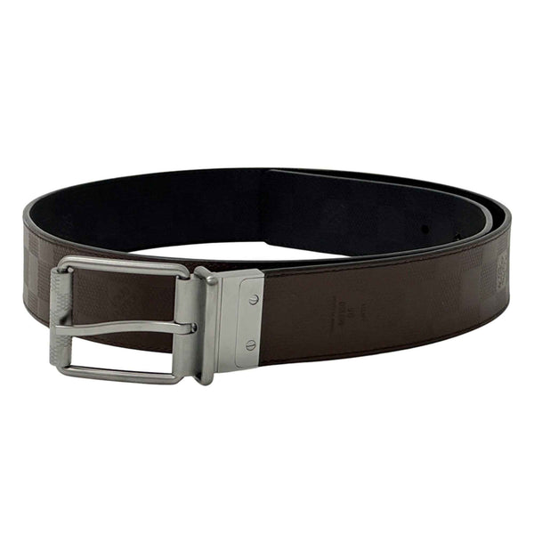 Louis Vuitton Damier Infini Men\'s Leather Belt, Reversible, Onyx, Black, Red, Bordeaux, and Wine M1950, with Silver Hardware