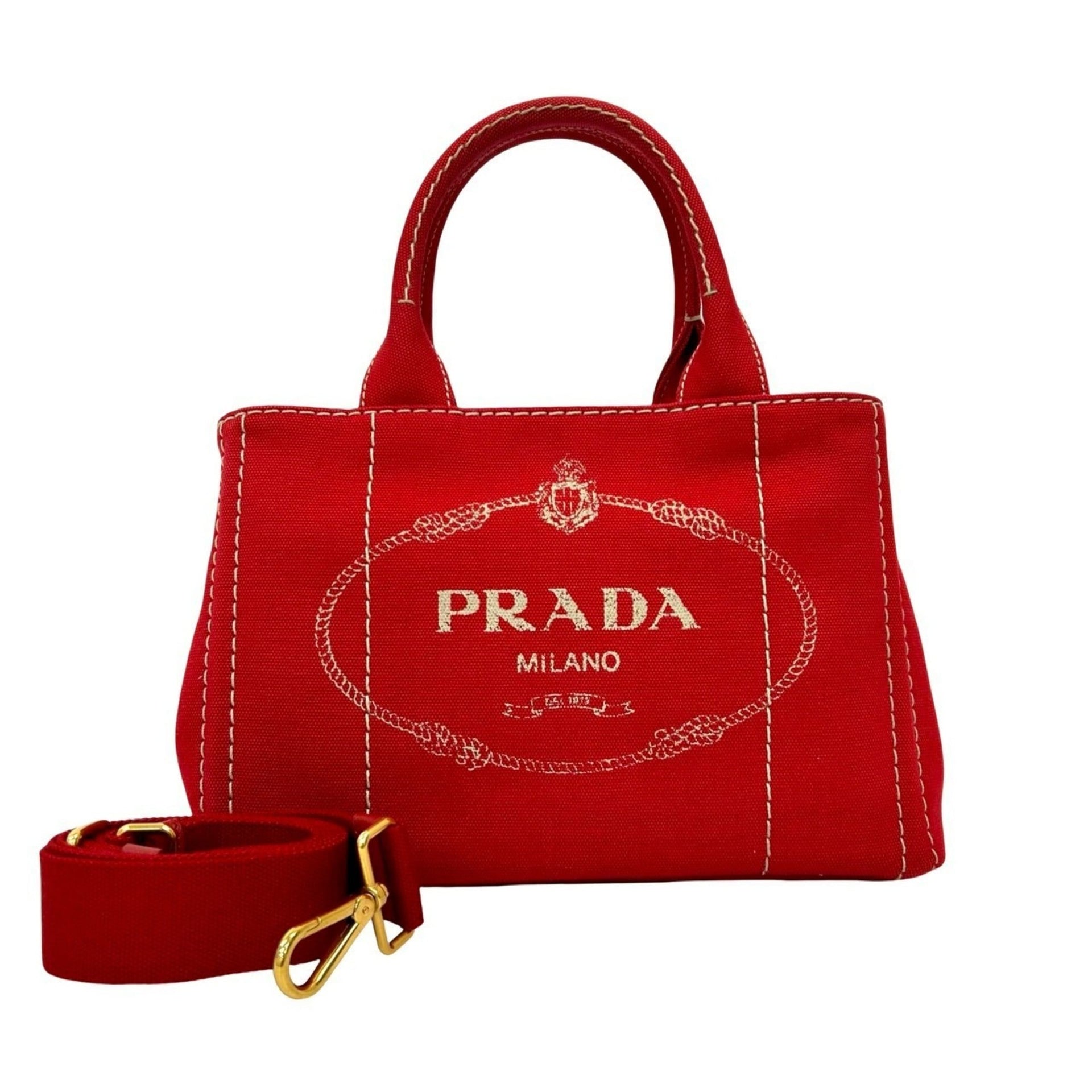 PRADA Canapa Logo Check Canvas 2-Way Handbag, Mini Tote Bag, Shoulder Red 04857