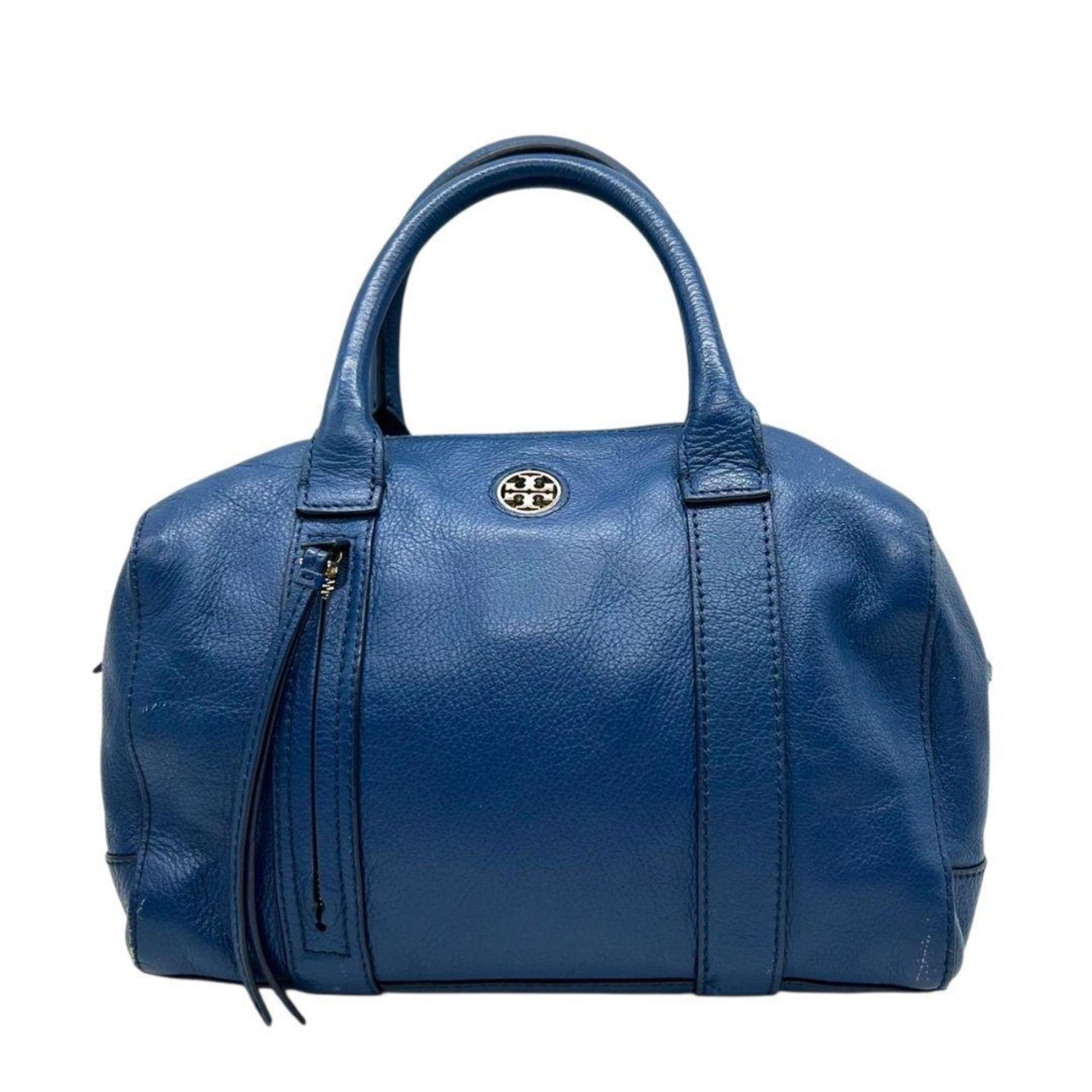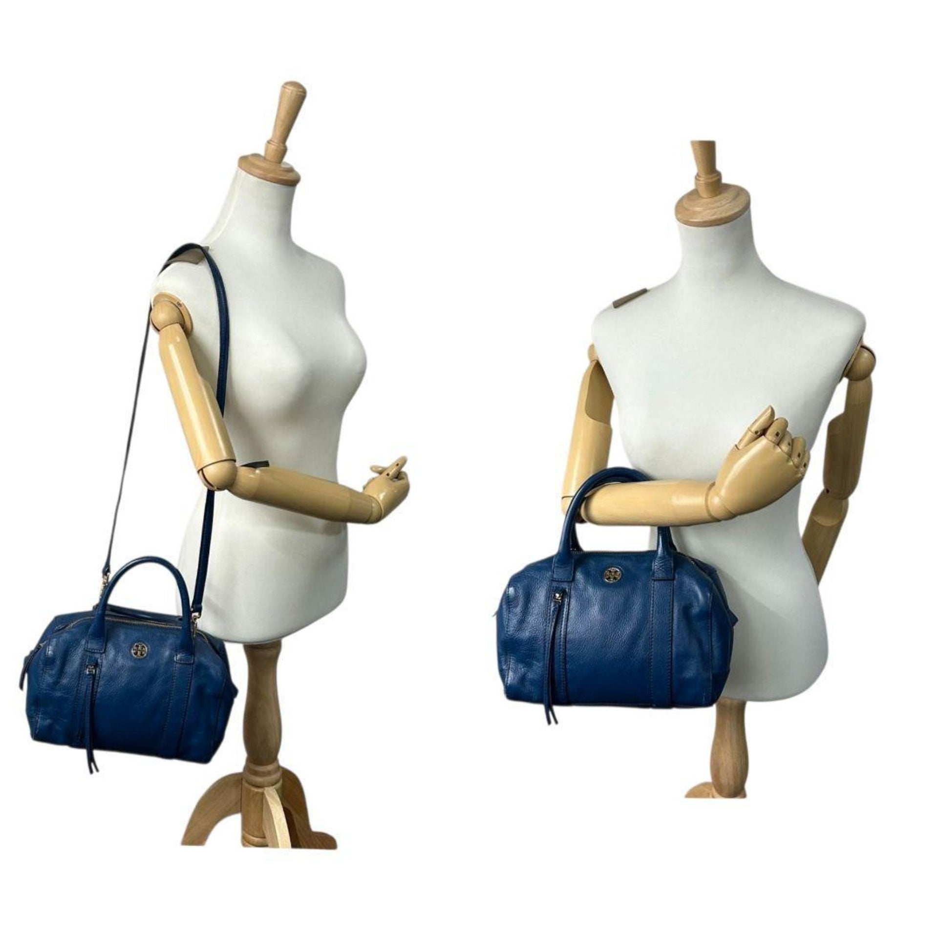 Tory Burch E5 handbag, blue, logo, 2-way, crossbody, leather, shoulder bag, tote dome-shaped, gold hardware, logo plate