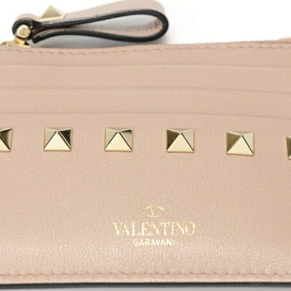 Valentino Studded Coin Card Holder Case Leather Pink Beige S-159014