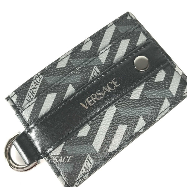VERSACE Men\'s Black Leather Business Card Holder with D-Ring and Logo, Pass Case, Case