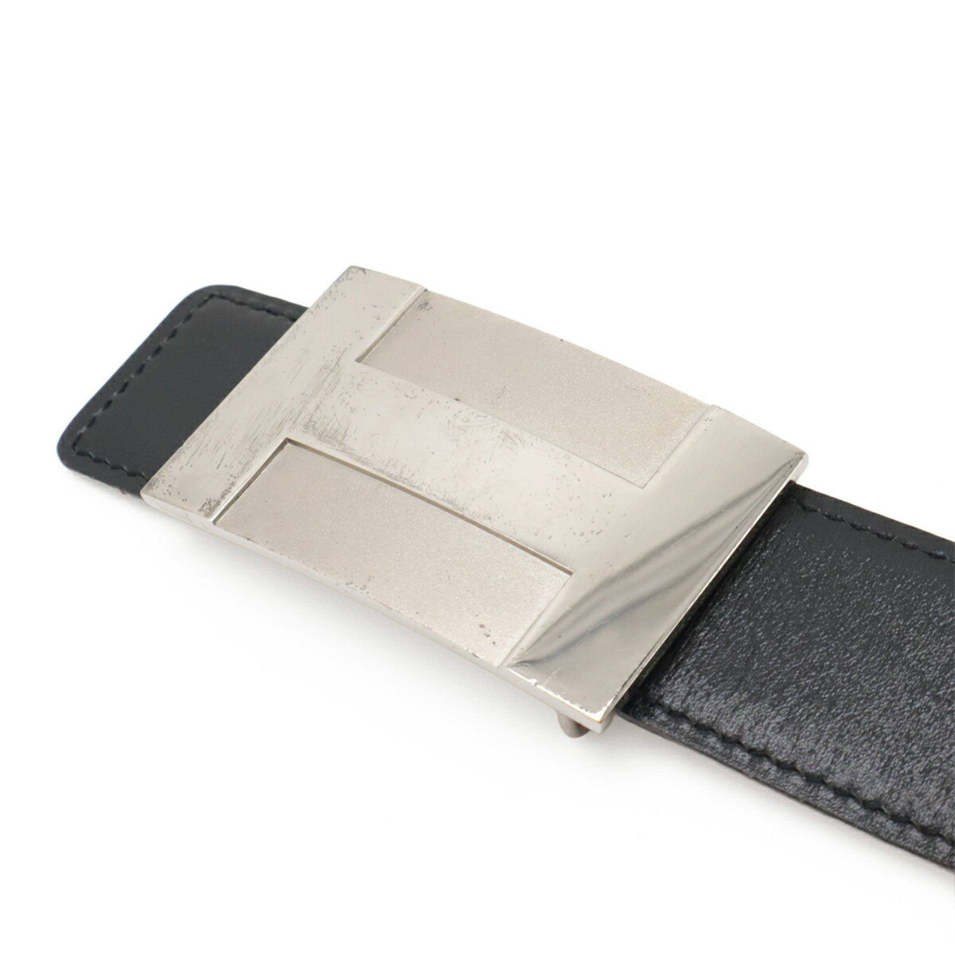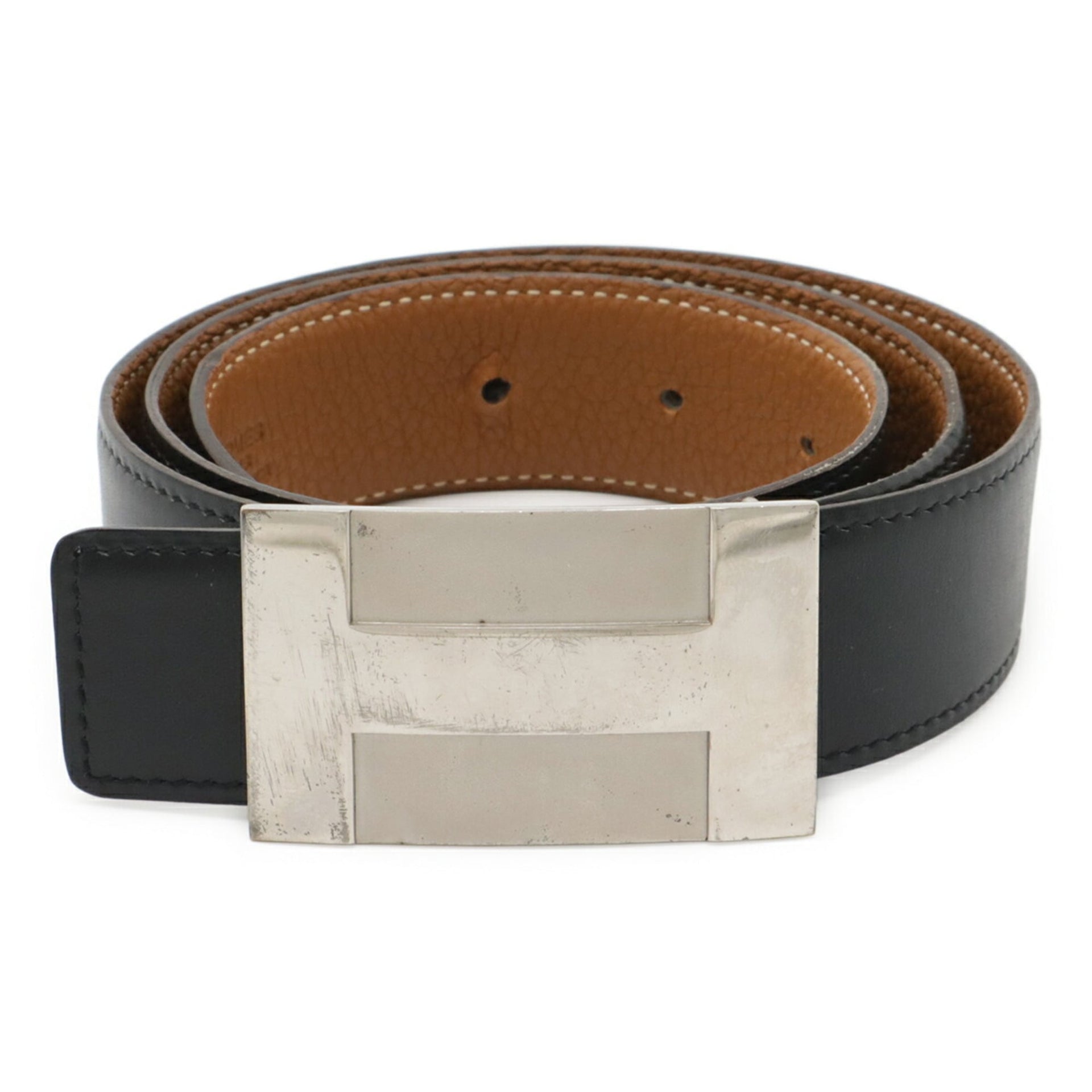 HERMES H-Plate Riem, Omkeerbaar, Box Calf Togo Leer, Zwart, Bruin, #80, Gegraveerd met L