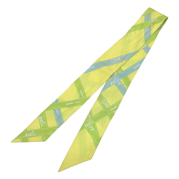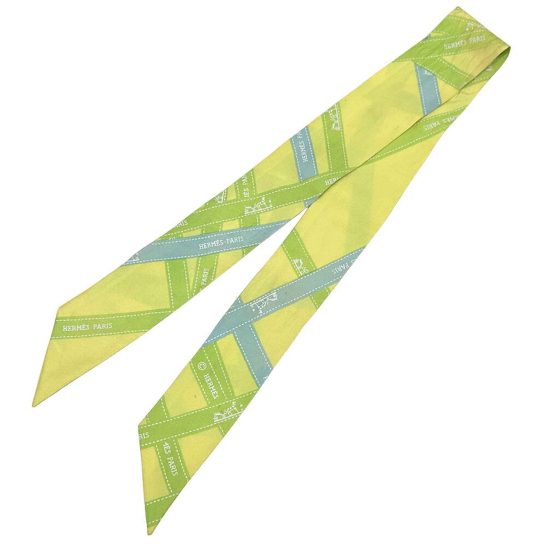 Hermes HERMES Scarf Muffler Twilly Voluduc Women\'s Men\'s Silk Yellow Light Green Blue Ribbon Pattern