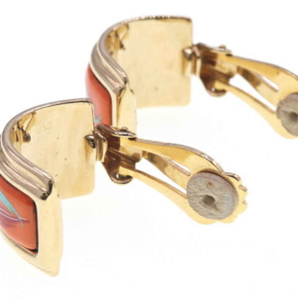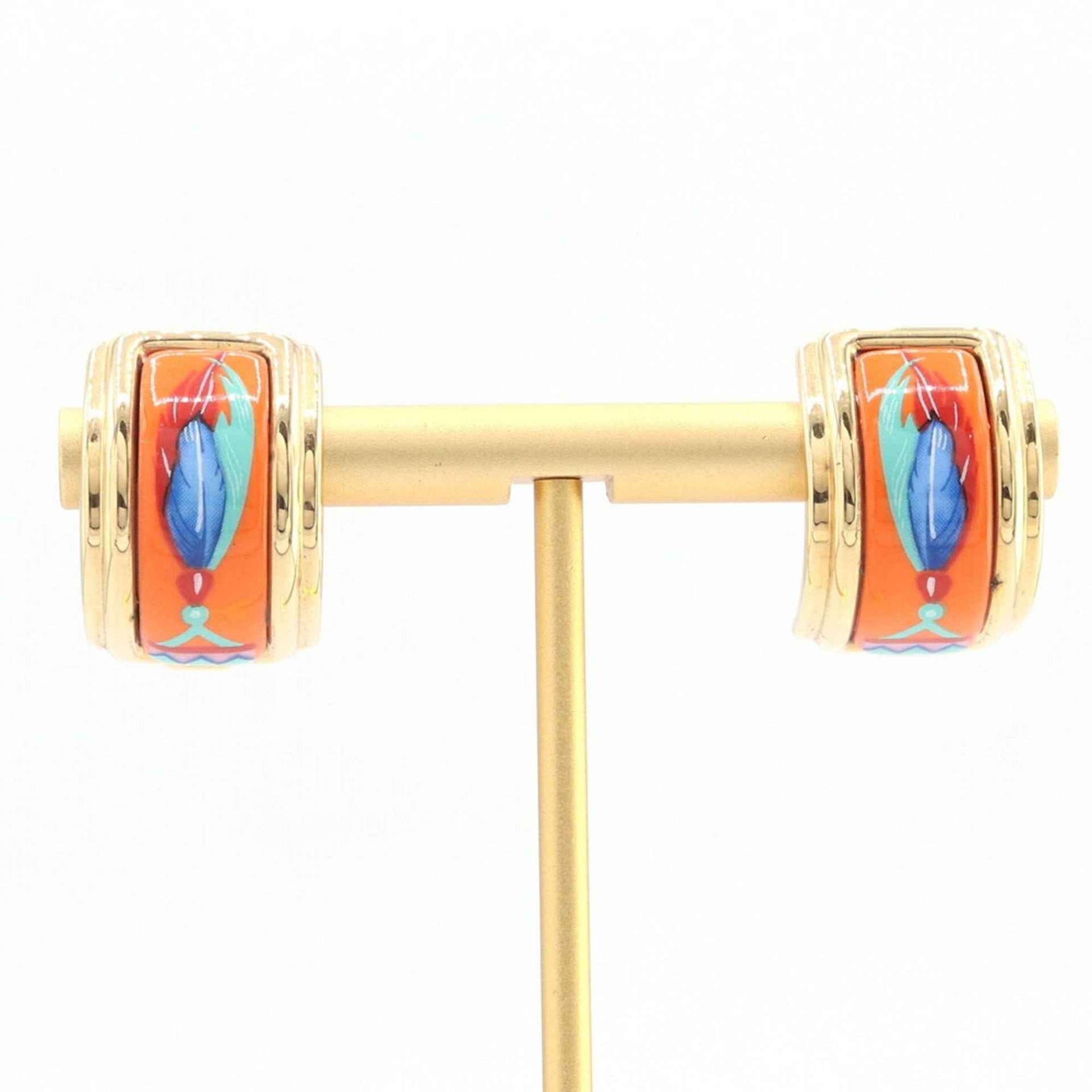 Hermes enamel earrings in orange and gold metal with cloisonné feathers for women.