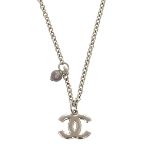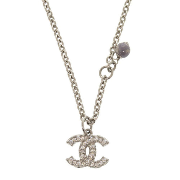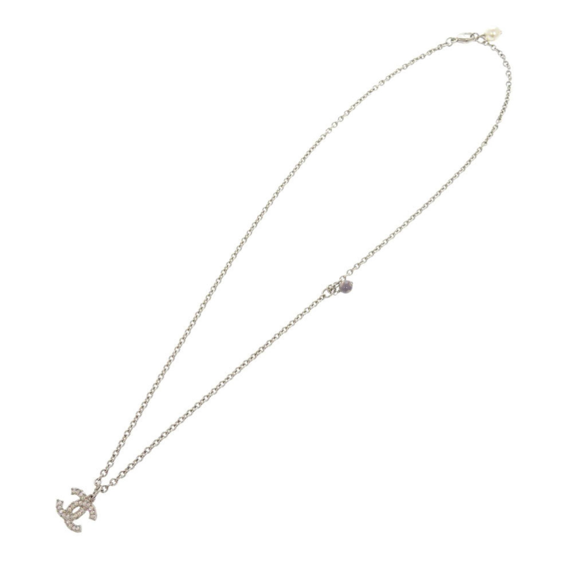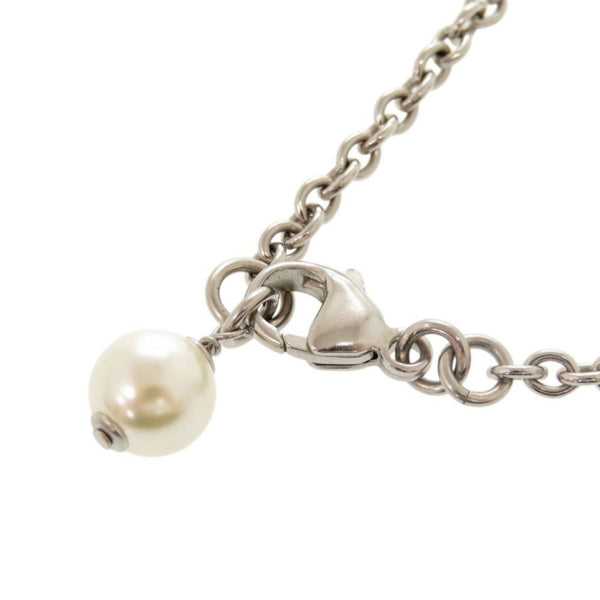 Chanel Coco Mark Metal Rhinestone Faux Pearl Silver Necklace 0470 CHANEL