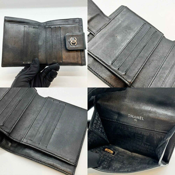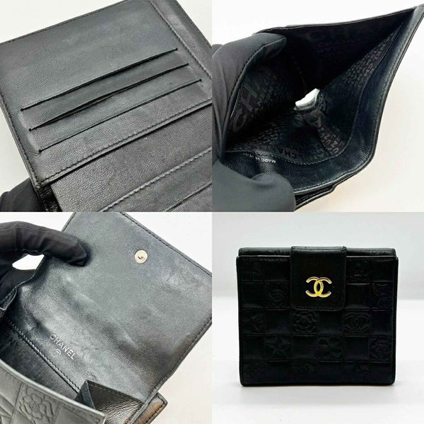 CHANEL Icon Line Bifold Wallet, Black, Calf Leather, Coco Mark, Camellia, and Clover Motifs, Women\'s