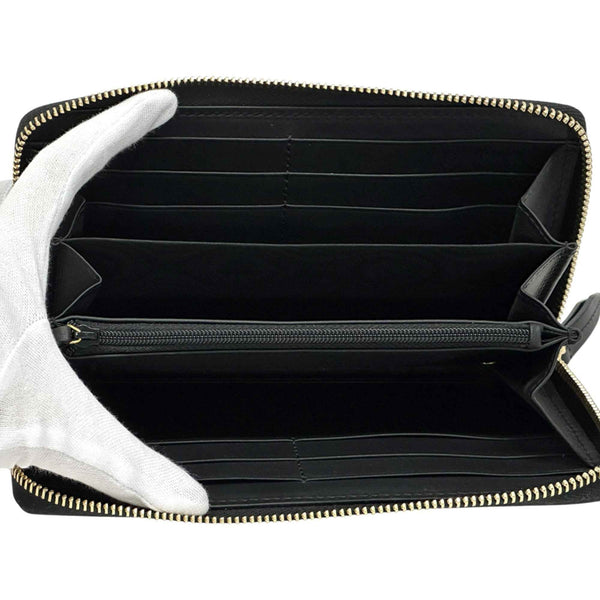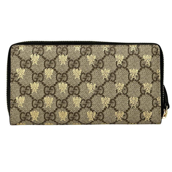 Gucci Animalier GG Supreme long wallet for men and women, brown gold PVC, 410102, with a round zipper bee motif.