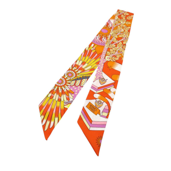 Hermes Like new Hermès Twilly \"The Source of Pegasus\" silk scarf/muffler in orange/mauve/white (0167)