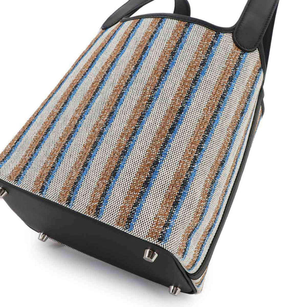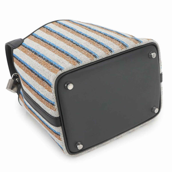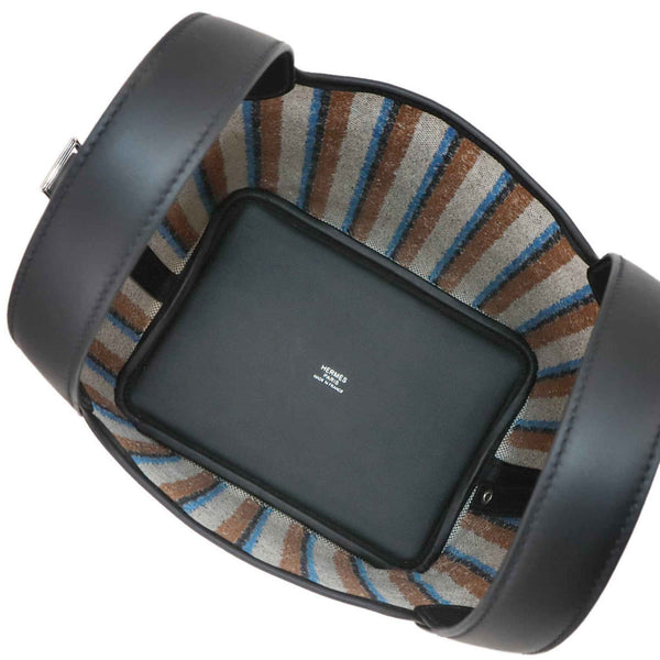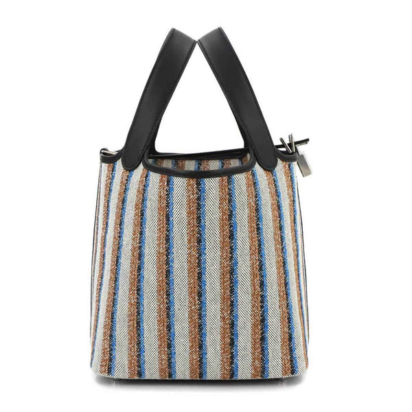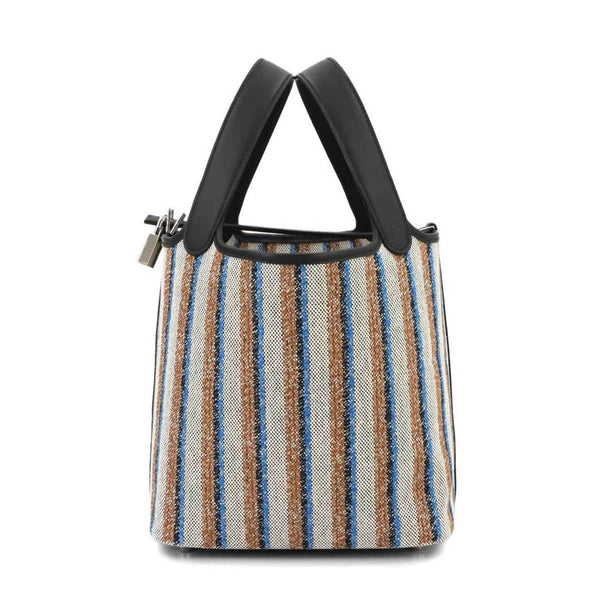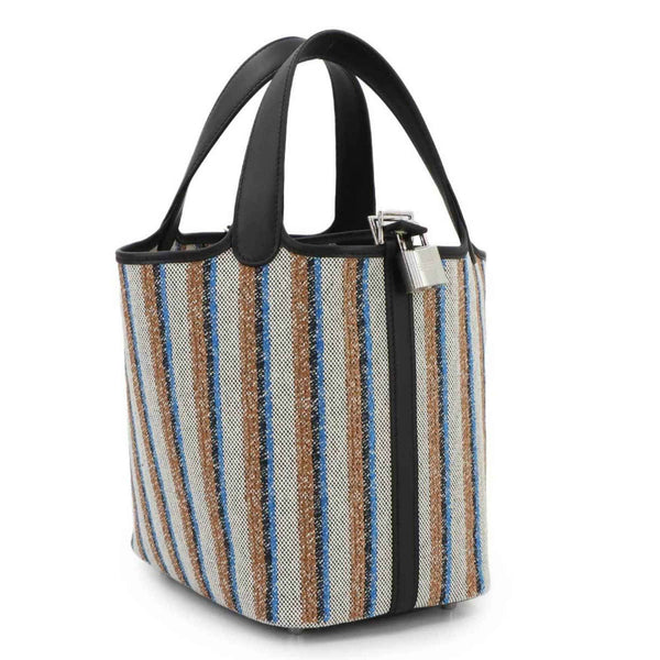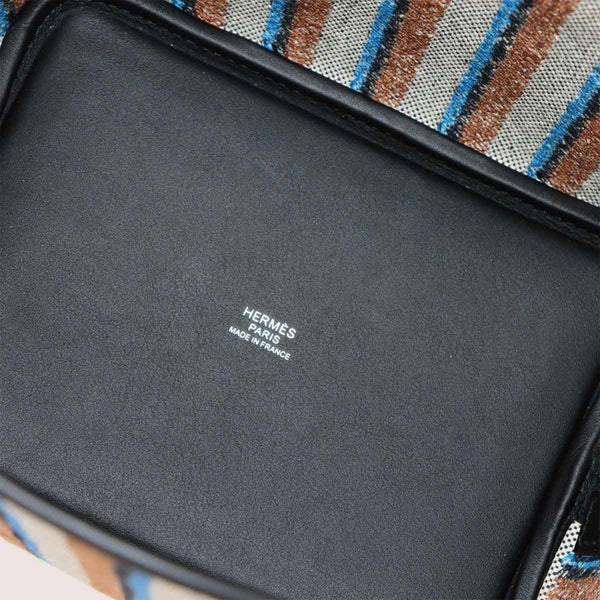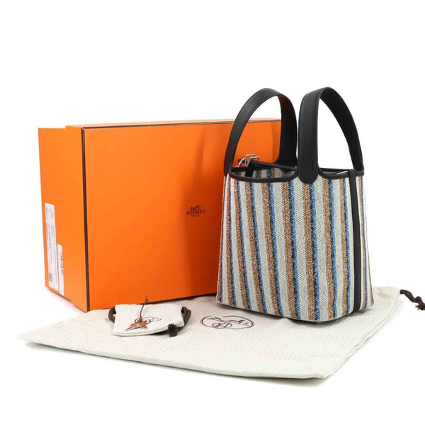 Hermès Picotin Lock 18 PM Couverture Toile H in Swift, Ecru, Black Fauve, and Blue Zanzibar. Double-stamped silver hardware.