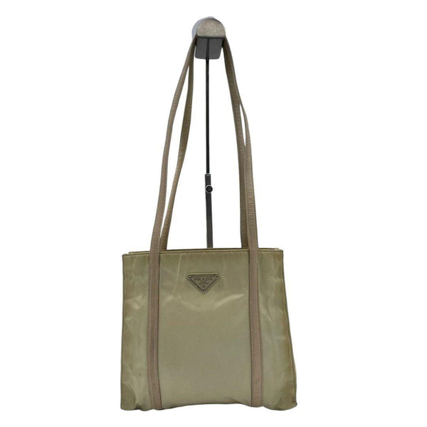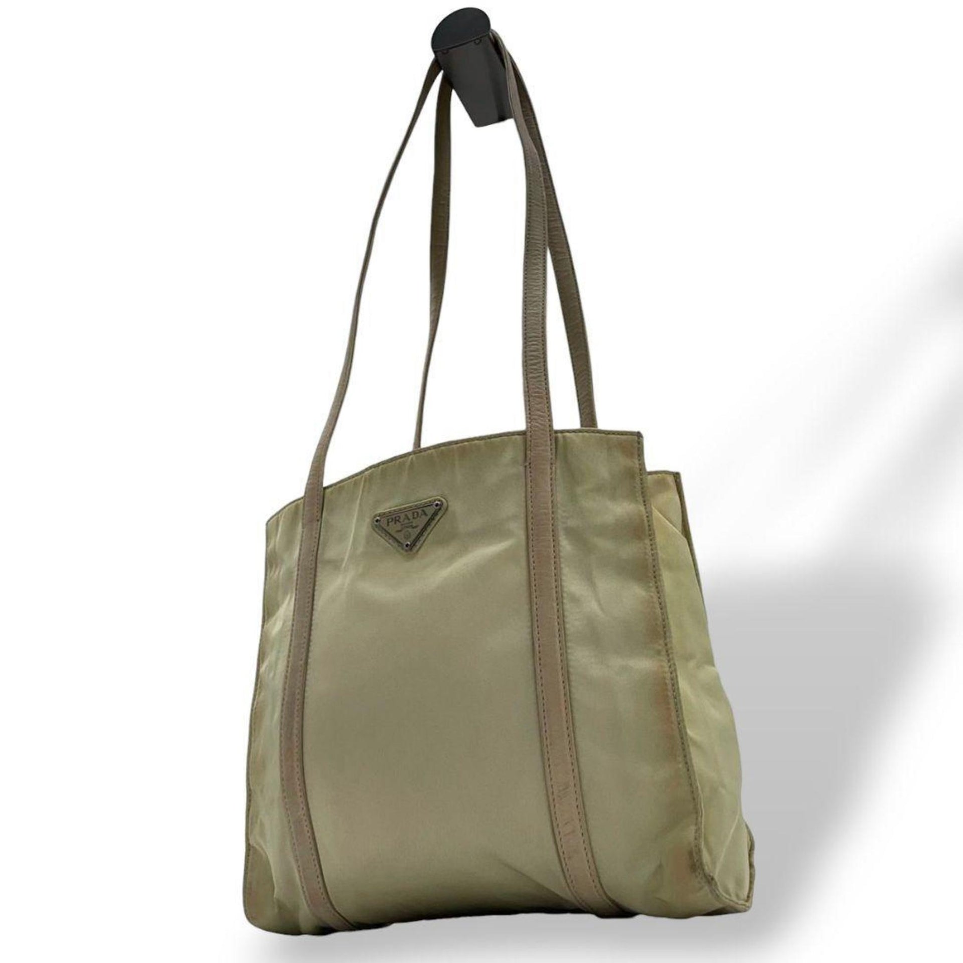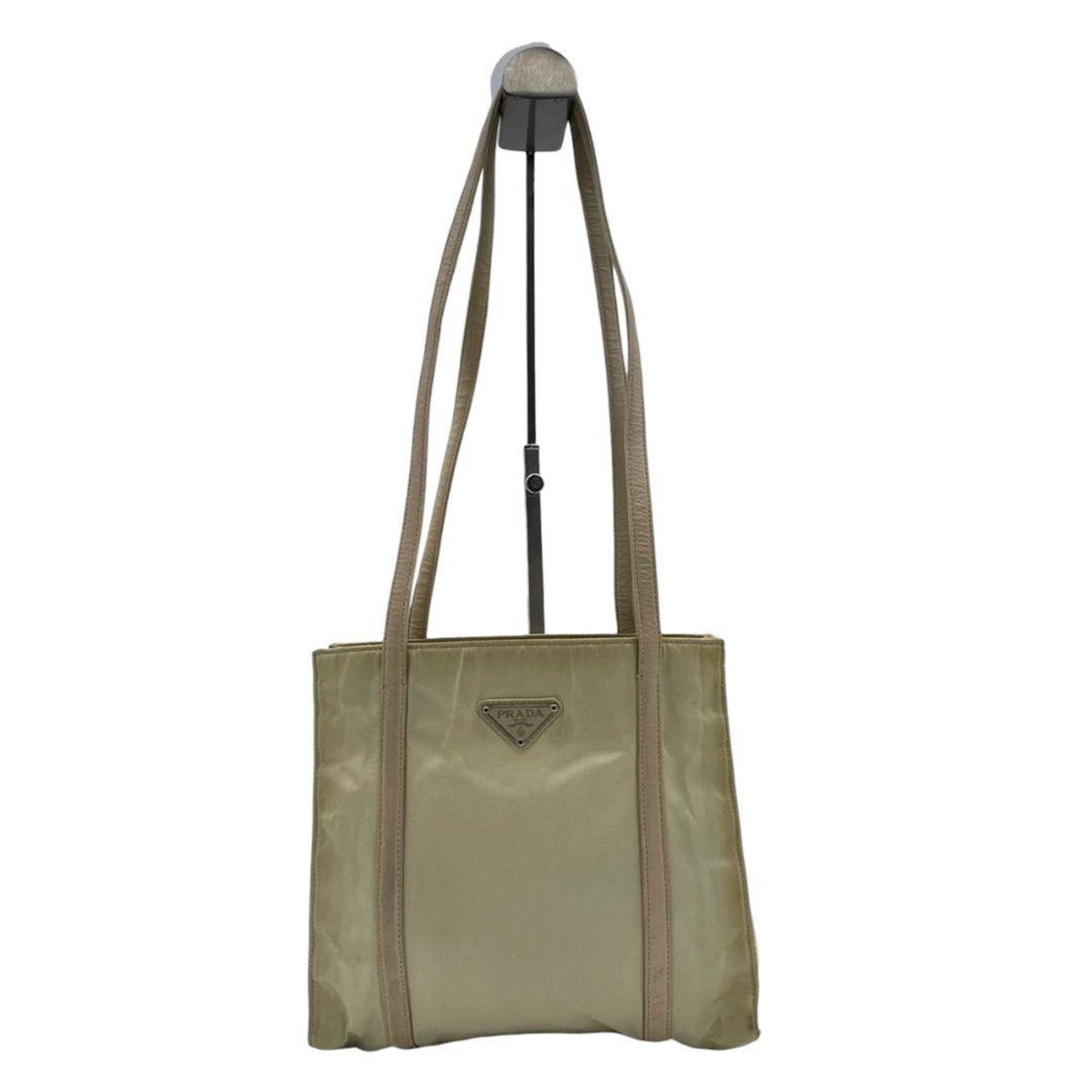 Prada Tessuto tote bag in beige with a triangular logo plate and silver hardware. Can be worn over the shoulder or on shoulder.