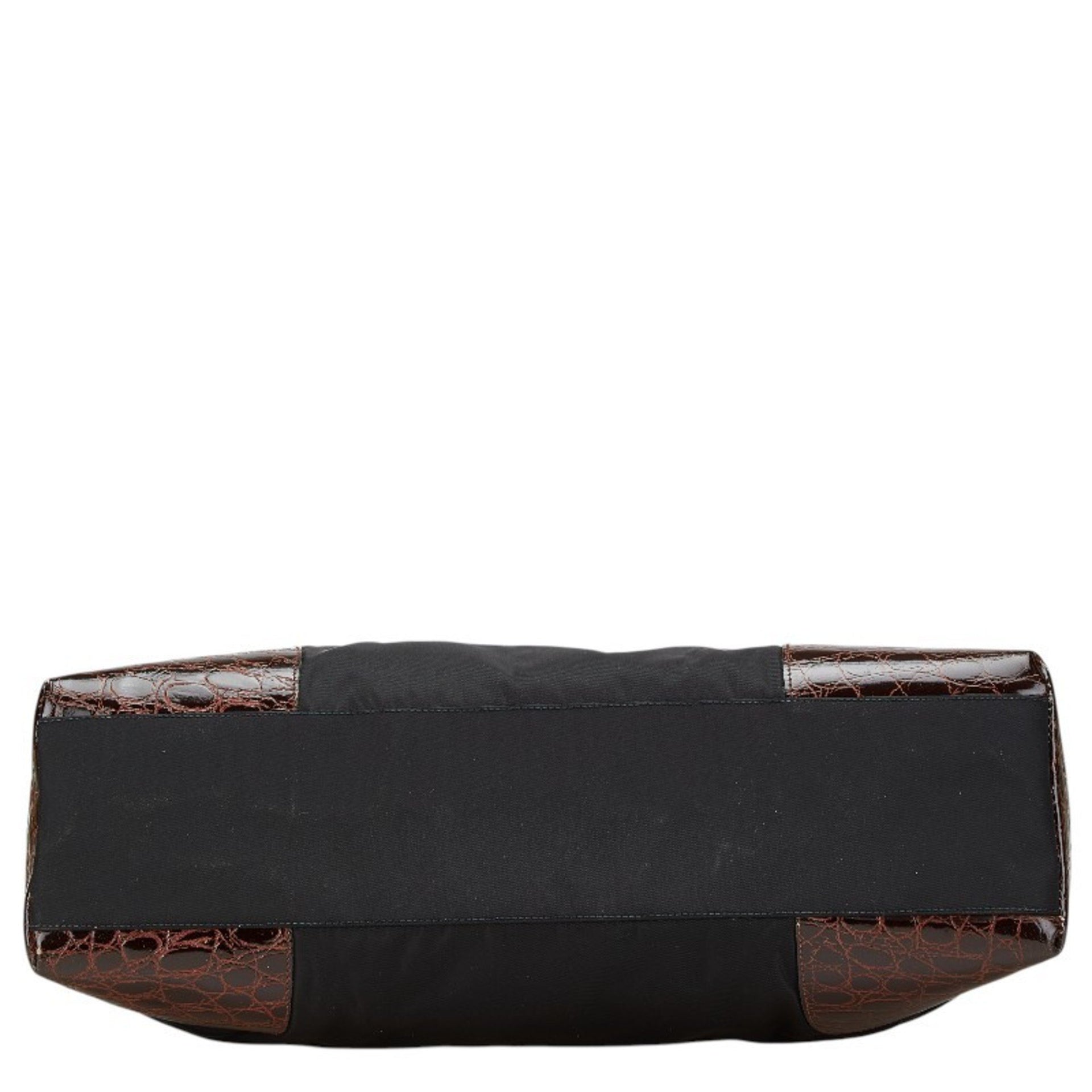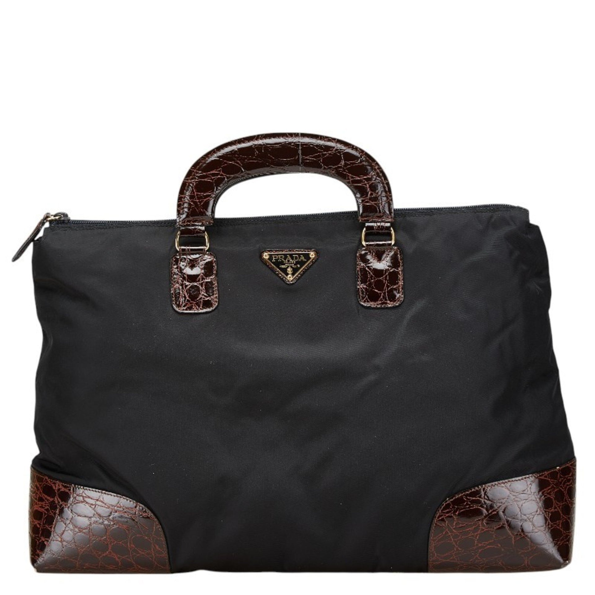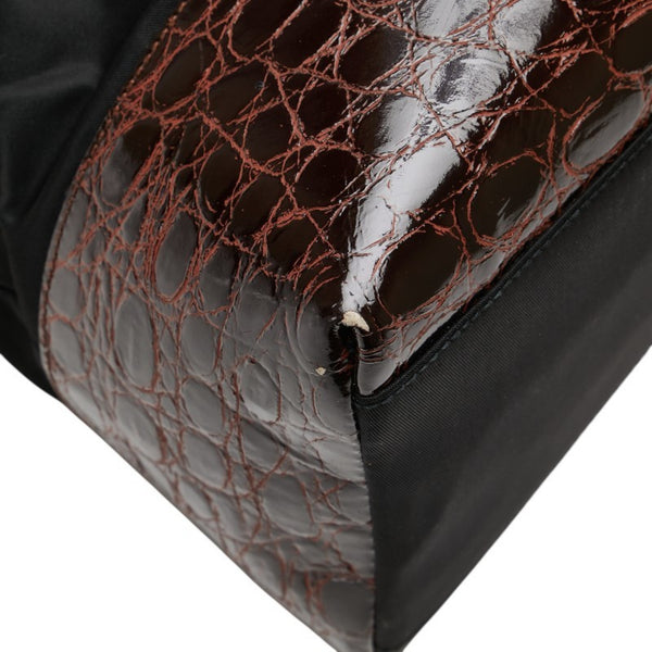 Prada Triangle Logo Plate Crocodile Embossed Handbag in Black and Brown Nylon Leather for Women