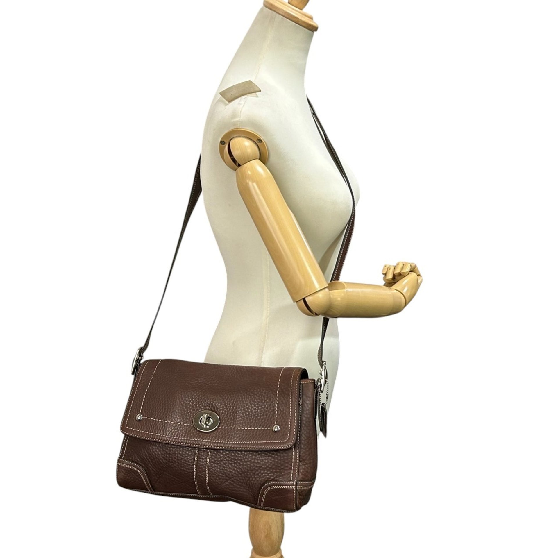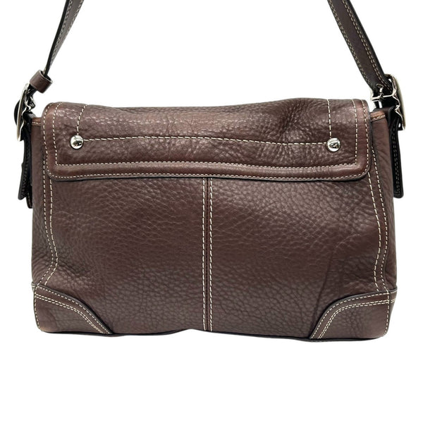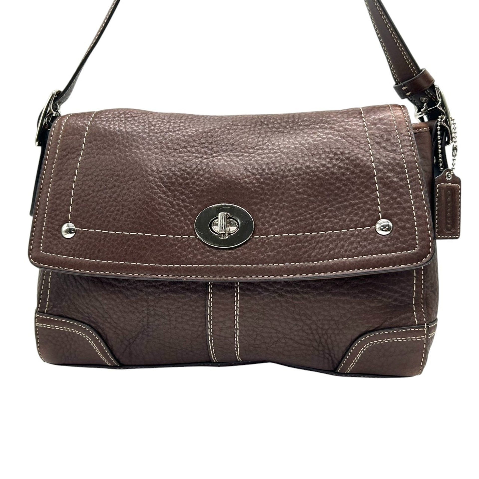 COACH Shoulder Bag F13957, Brown Grained Leather with Turn Lock and Flap Closure, White Stitching, Silver Hardware, Women\'s, 2000s, 53 Years\' Manufacture