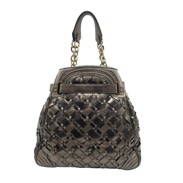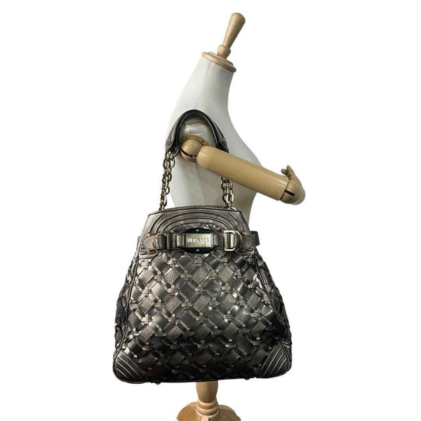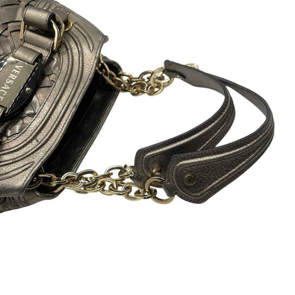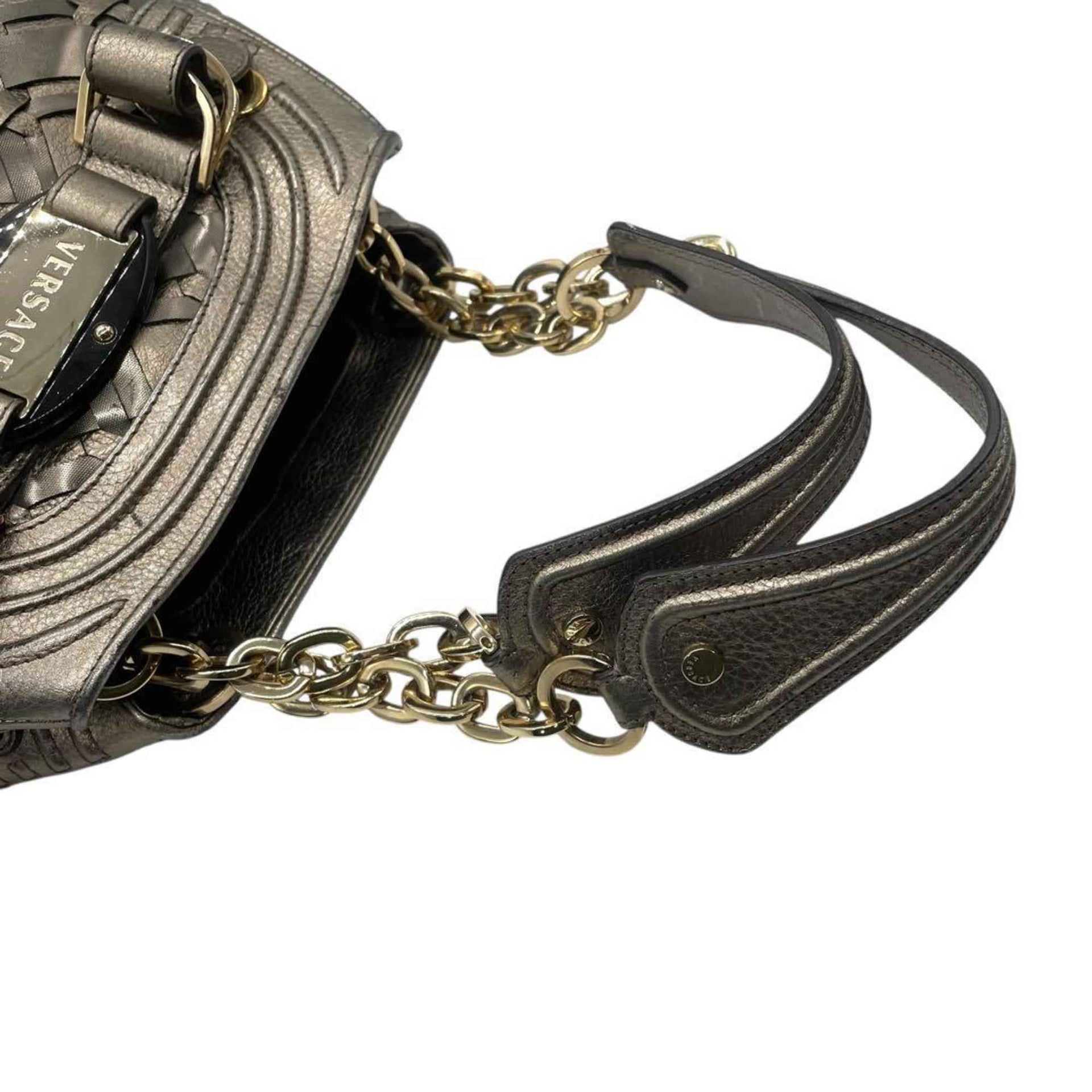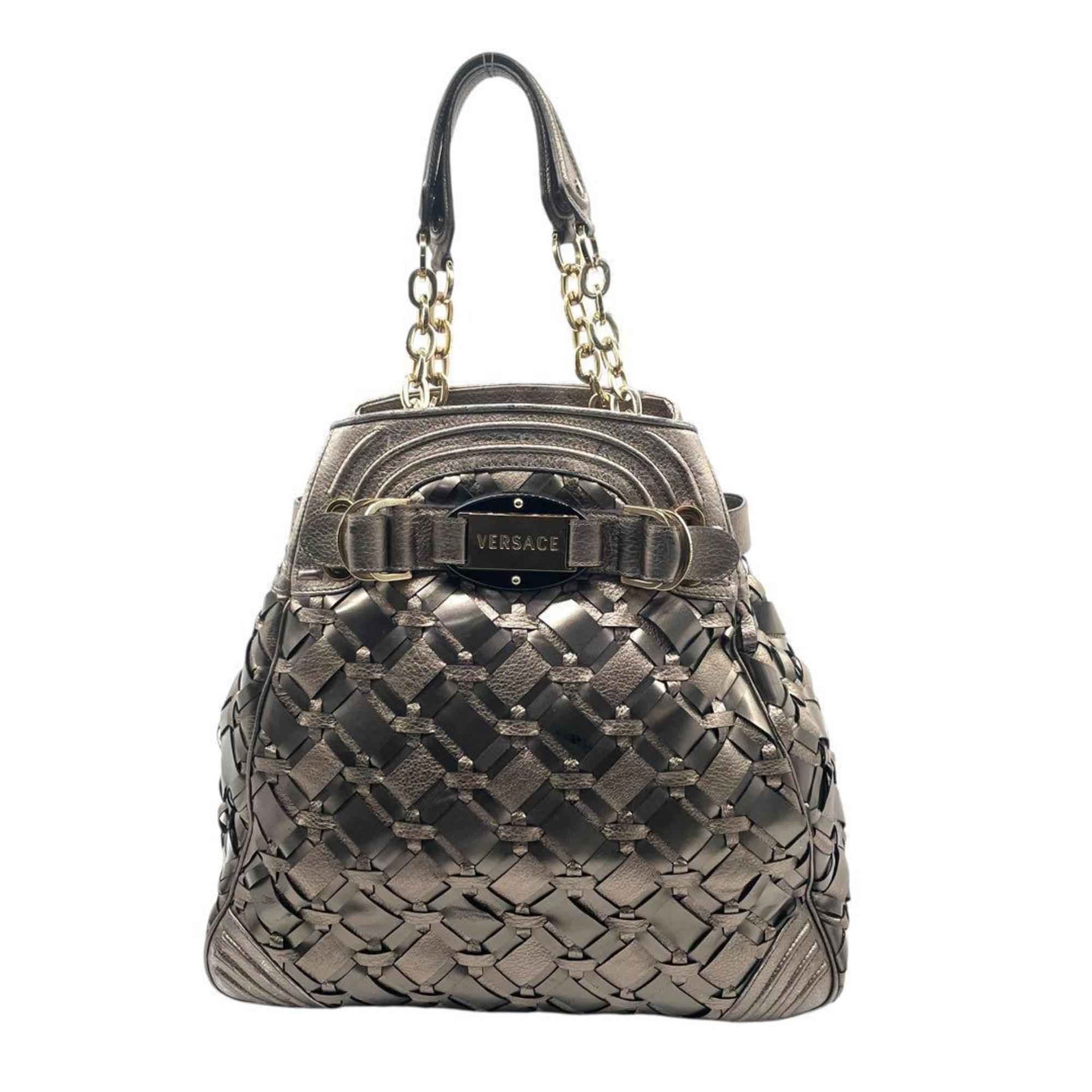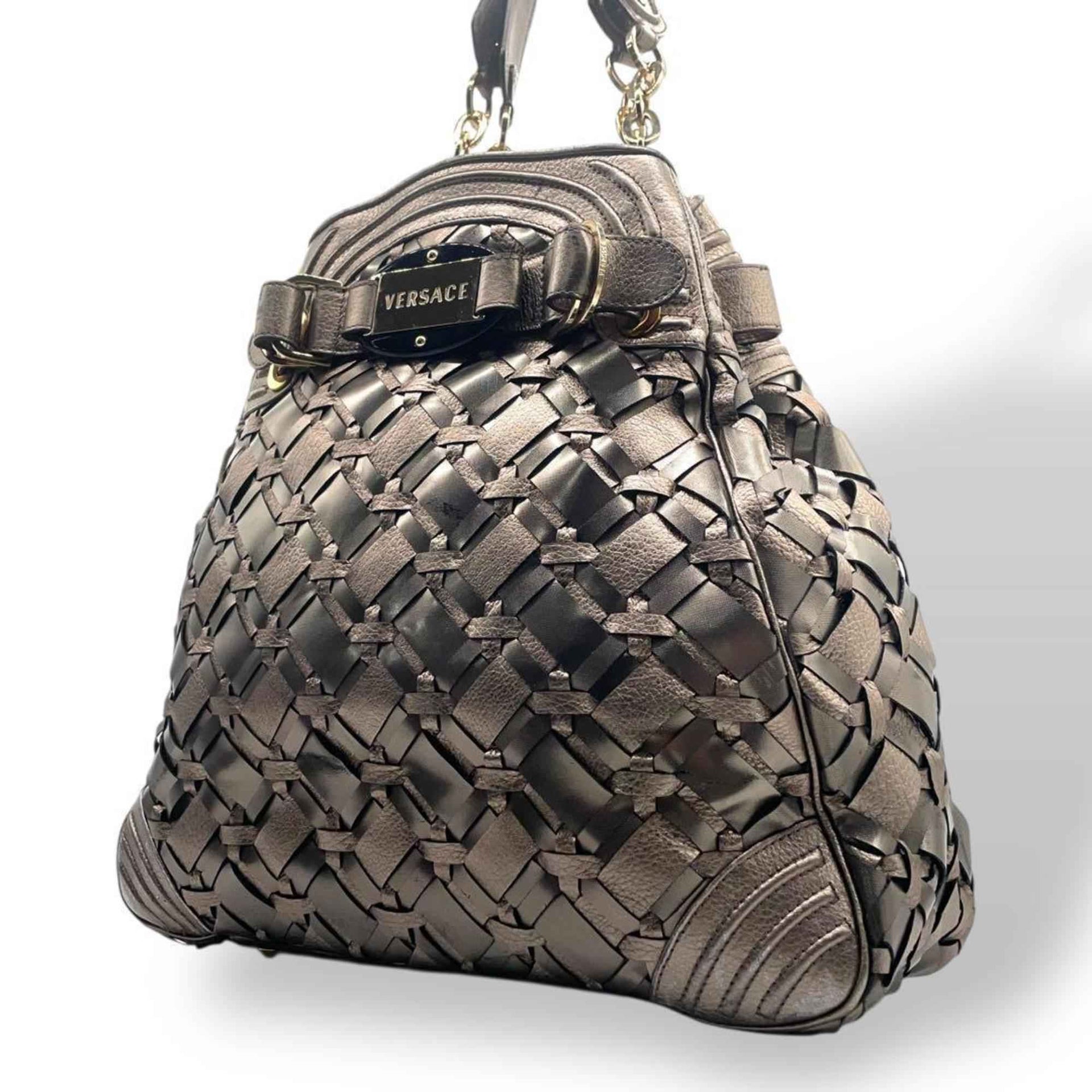 Versace T5 Tote Bag in Gradient Gray, Silver, and Bronze. Braided Leather, One-Shoulder Bag, Handbag with Gold Hardware Engraved Logo.