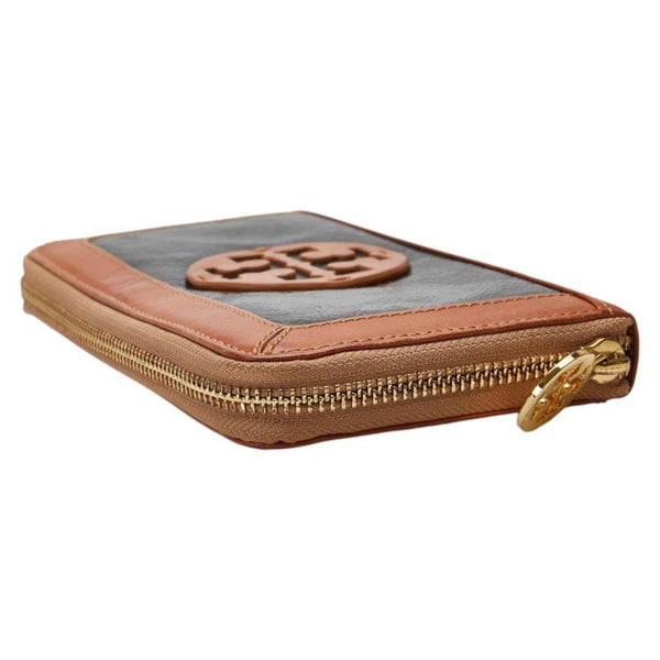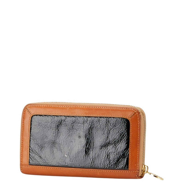 Tory Burch L-shaped zipper long wallet in brown, black, patent leather, for women.