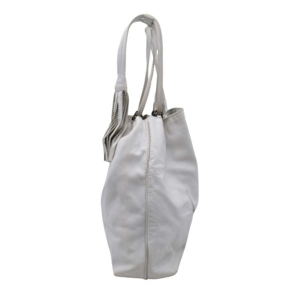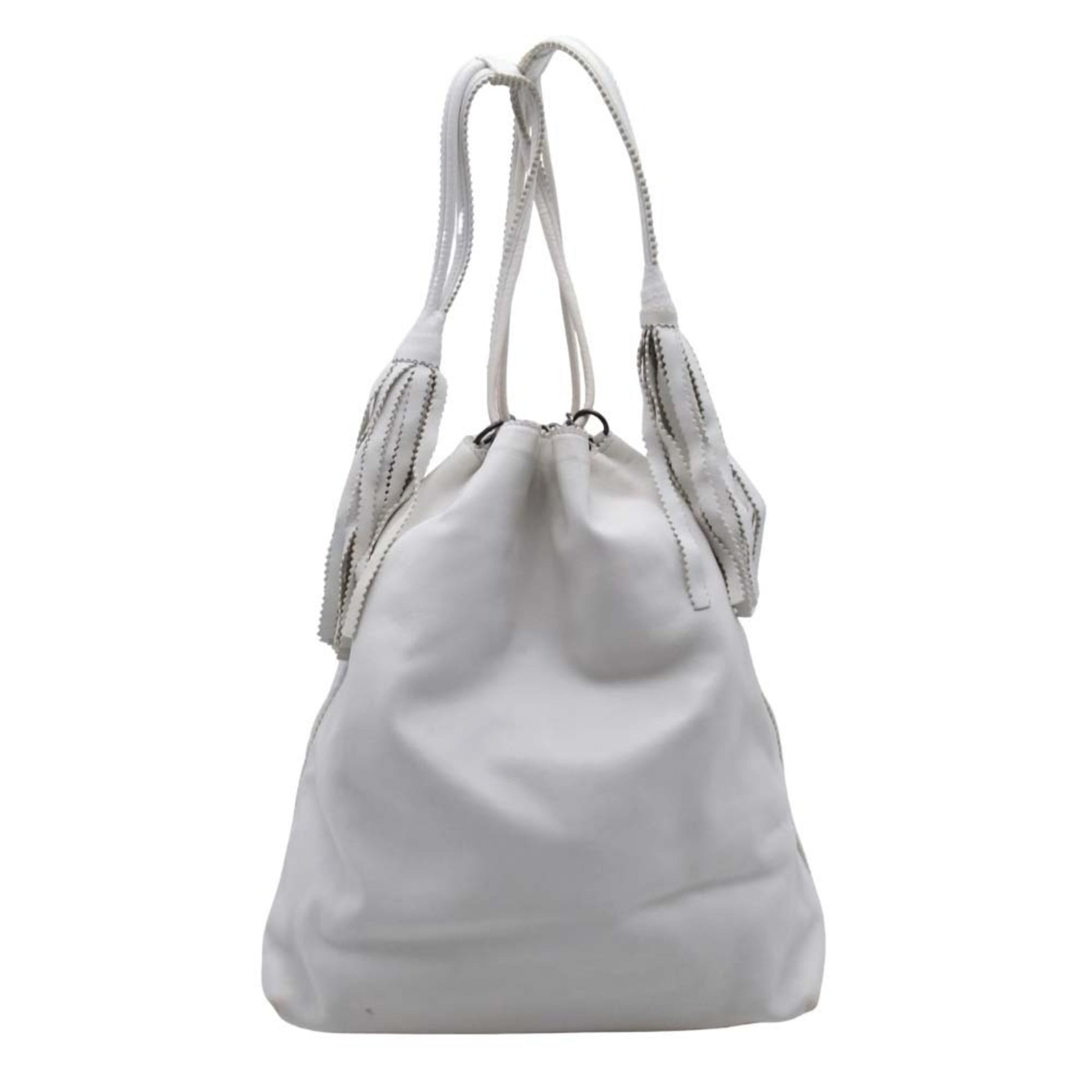 BOTTEGA VENETA Drawstring Shoulder Bag, Leather with Fringe, White, Old Style, Women\'s