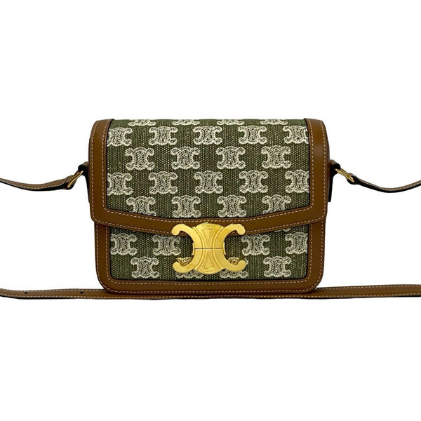 CELINE Teen Triomphe Logo Hardware Leather Canvas Shoulder Bag Pochette Brown Khaki 37173