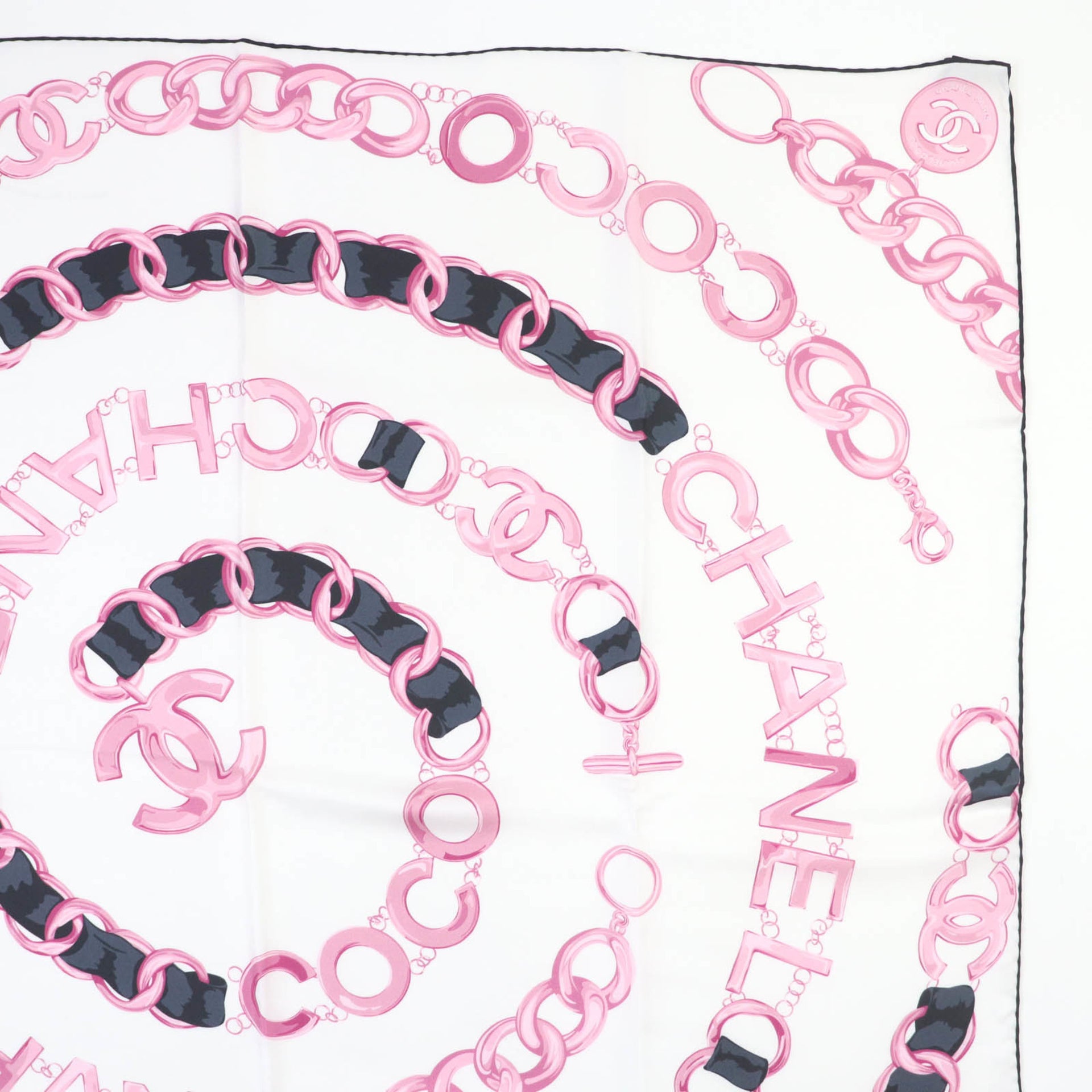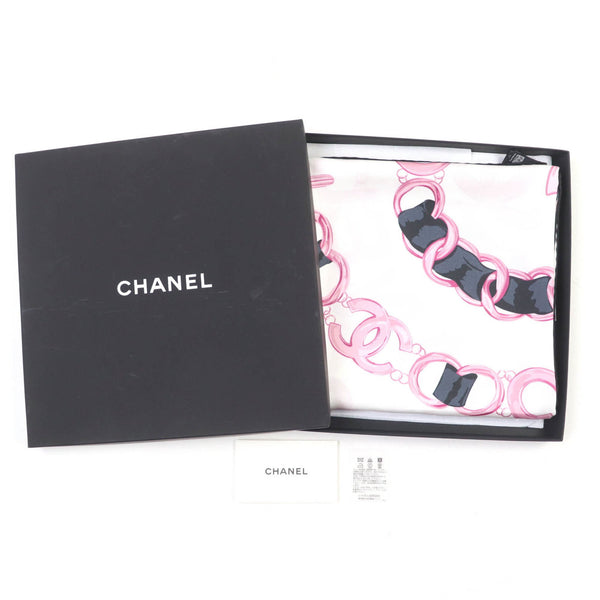 CHANEL 100% Silk Coco Mark Chain Belt Pattern Scarf in White and Pink, with Box, Made Italy, Women\'s