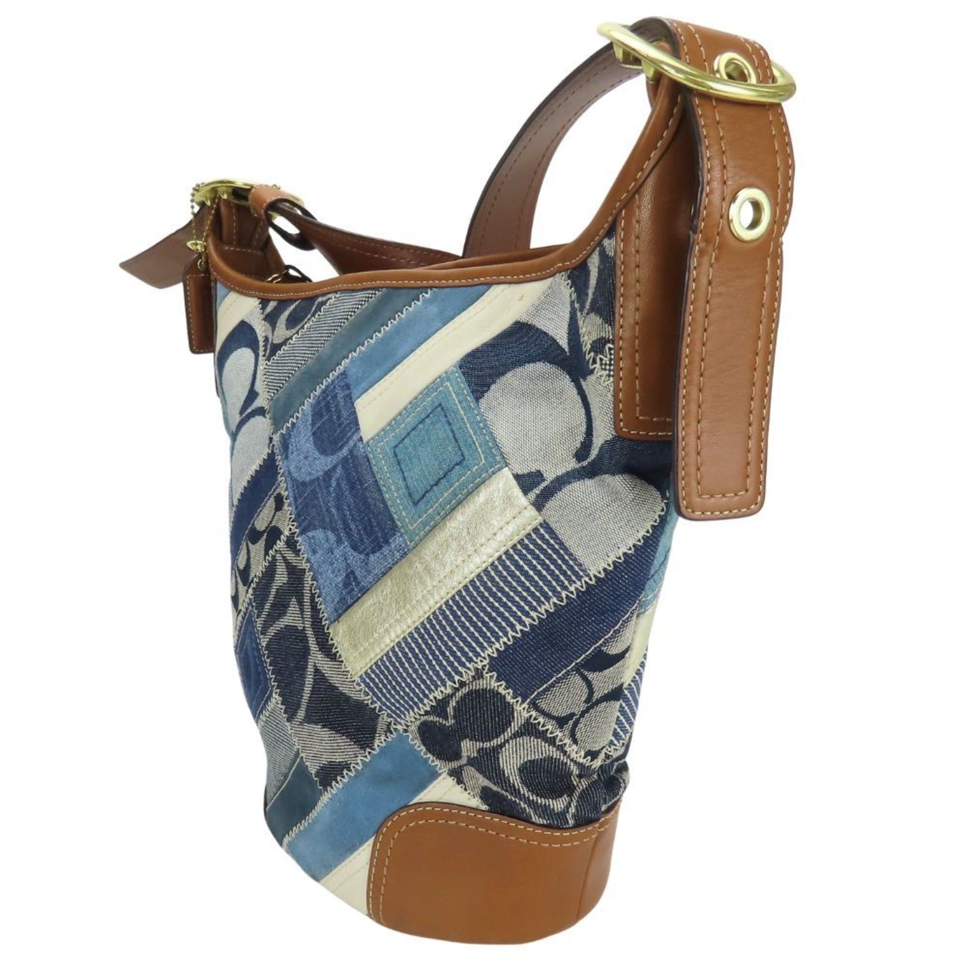 Coach 12213 Signature Bucket Shoulder Bag in Denim, Leather, and Suede with Patchwork Blue, Brown, White, Silver.