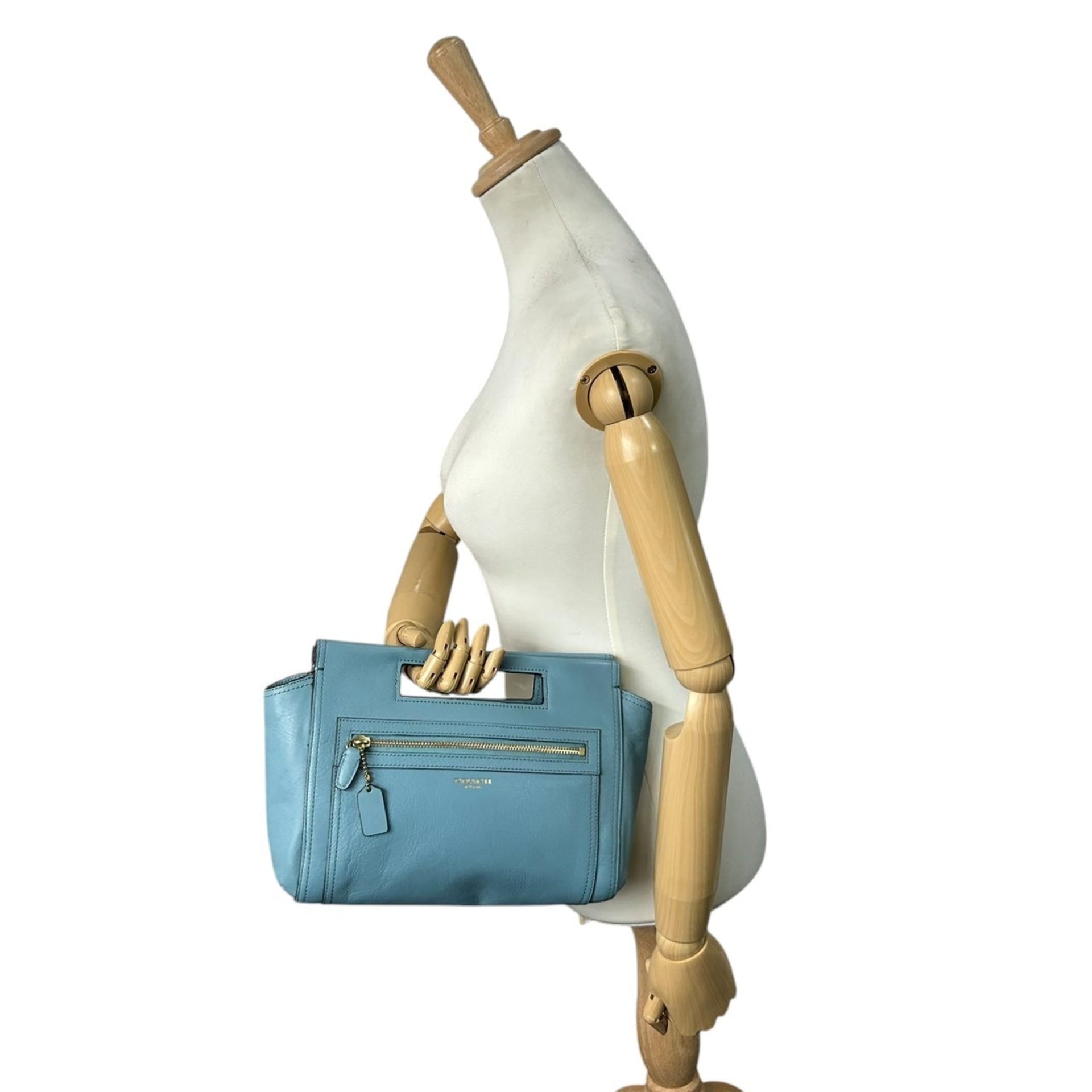 Coach handbag/clutch bag with cutout handles, light blue leather, gold hardware, and logo, women\'s size s97