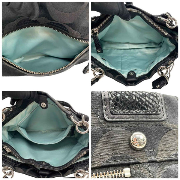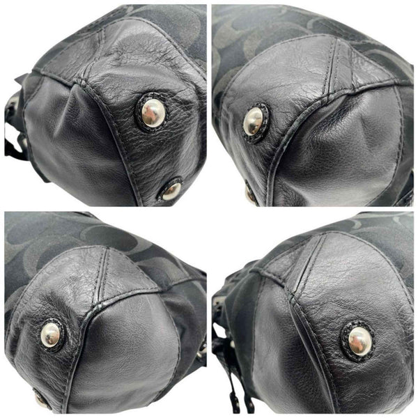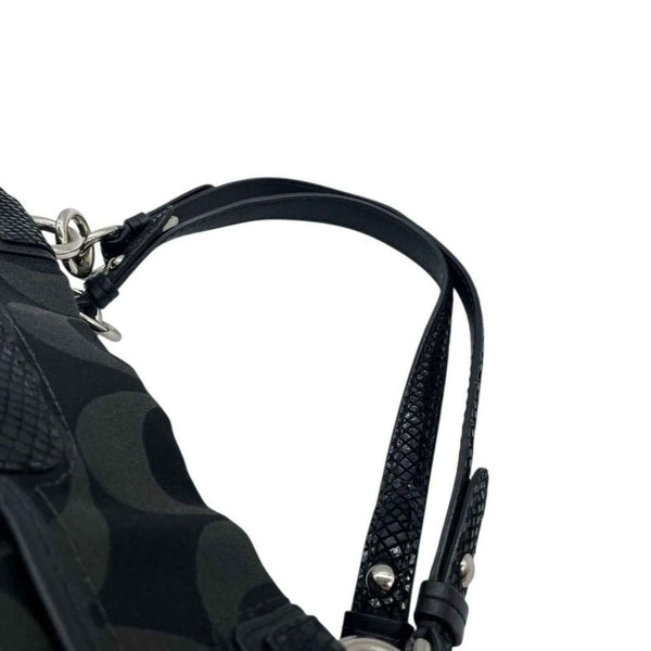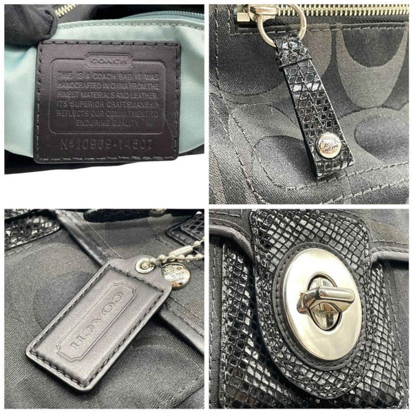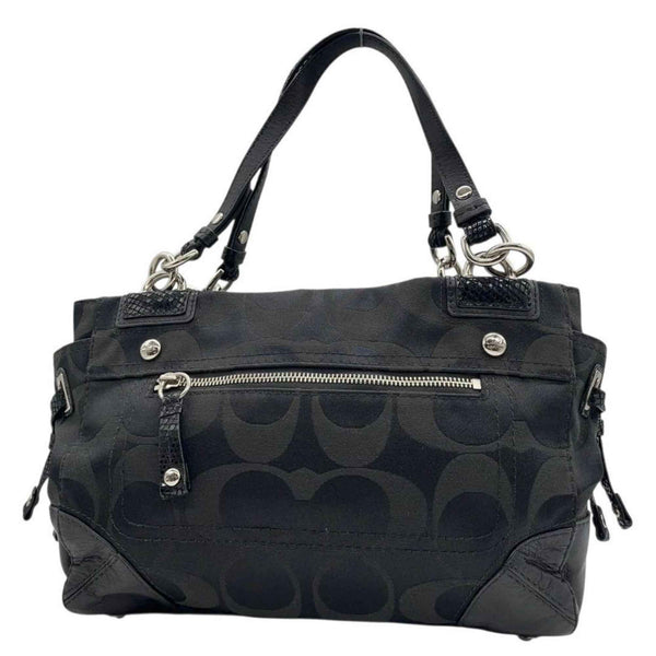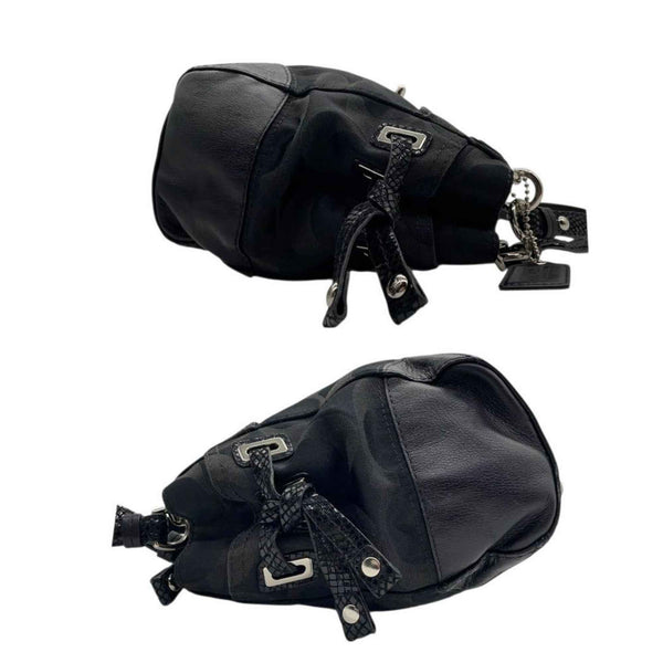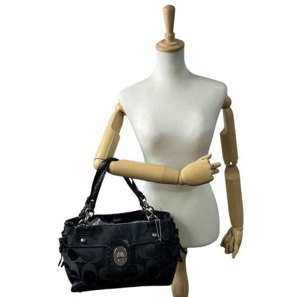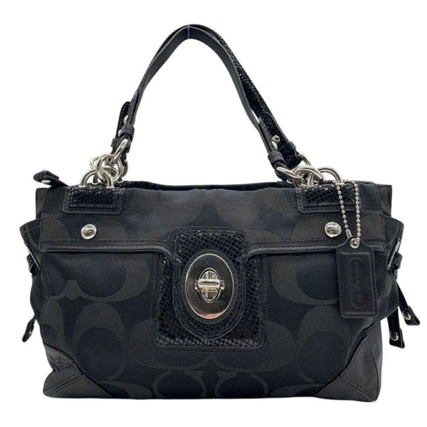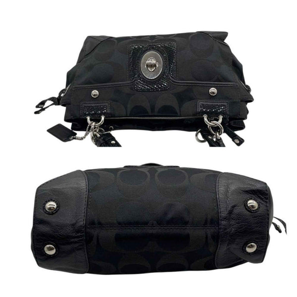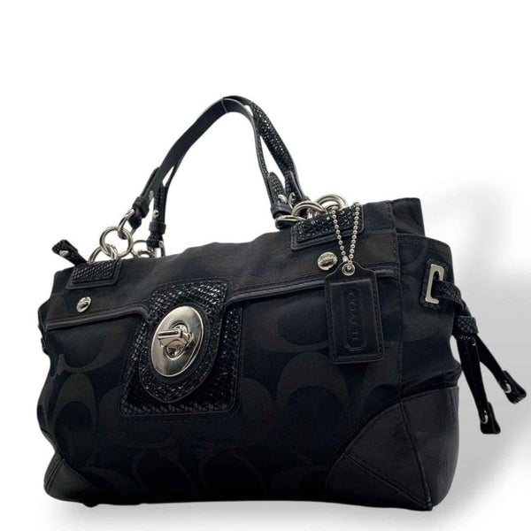 Coach Signature One-Shoulder Handbag in Black Leather and Canvas with Turnlock, Silver Hardware, Logo Tag. Can be worn over the shoulder.