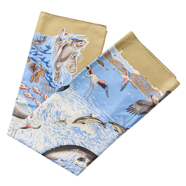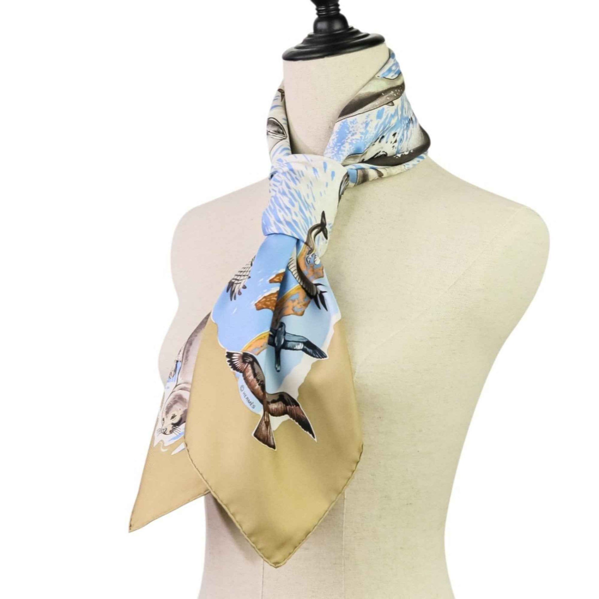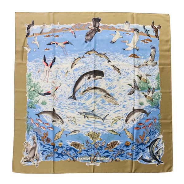 HERMES Carré 90 \"Lavie Precieuse de la Mediterranee\" (Precious Life of the Mediterranean) scarf/muffler in beige and blue for women