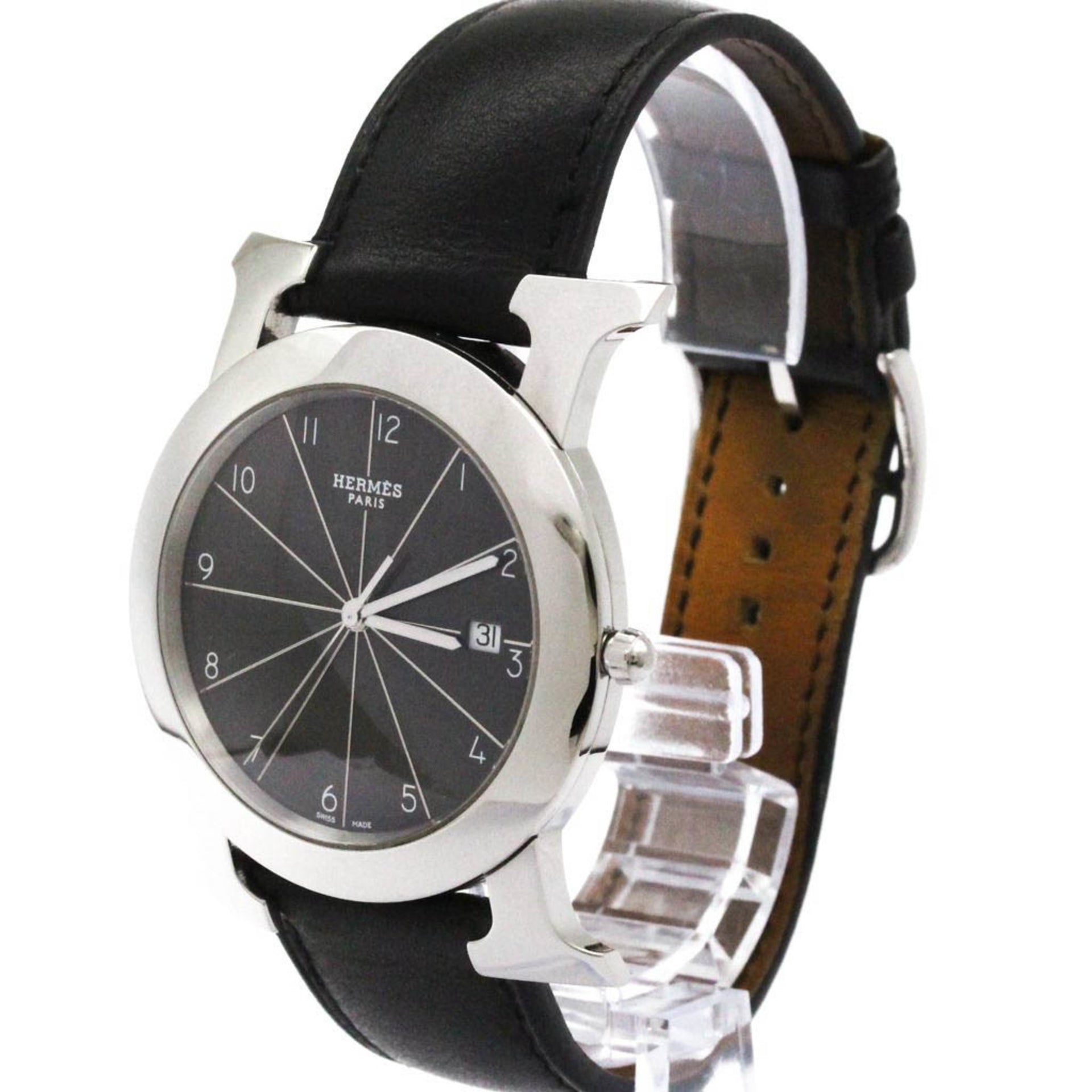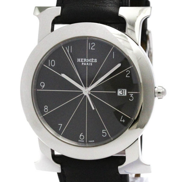 HERMES H Watch Rond Steel Leather Quartz Mens Watch HR1.710 Polished
