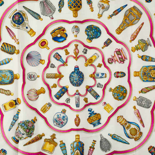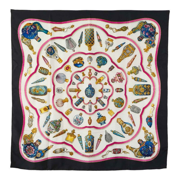Hermes Hermès Carré 90 \"Qu Importe Le Flacon\" Perfume Bottle Scarf/Muffler in Black, White, and Multicolor Silk for Women