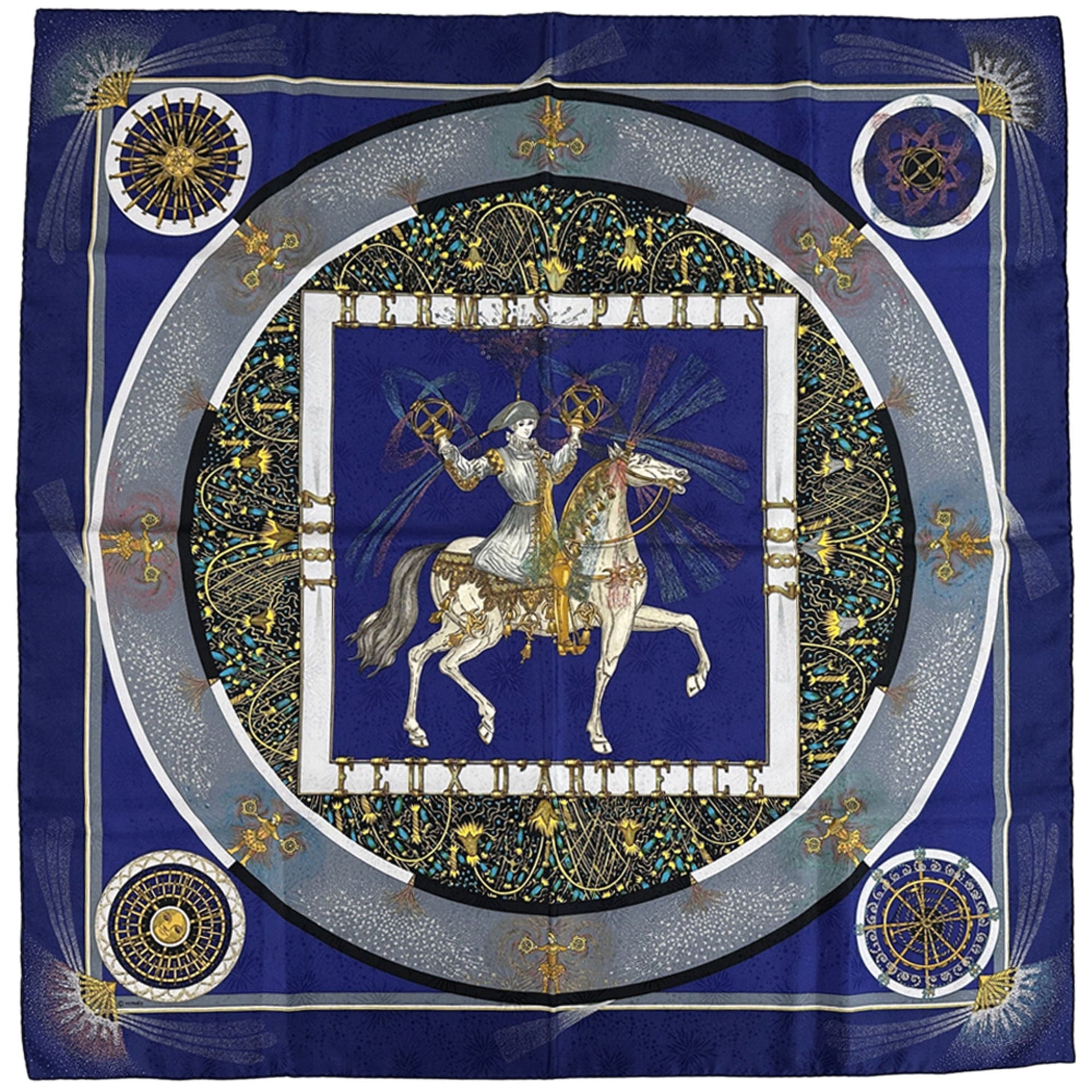 Hermes Hermès FEUX D\'ARTIFICE Carré 90 Scarf, Women\'s Silk, Blue, Multicolor, Horse, Fireworks, Large