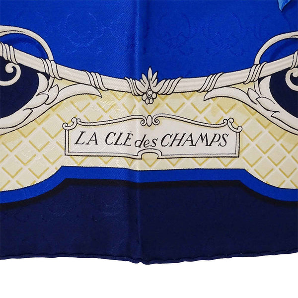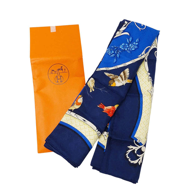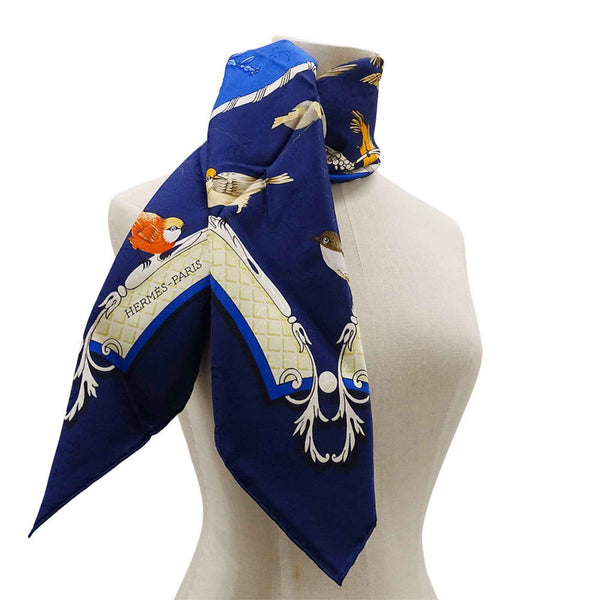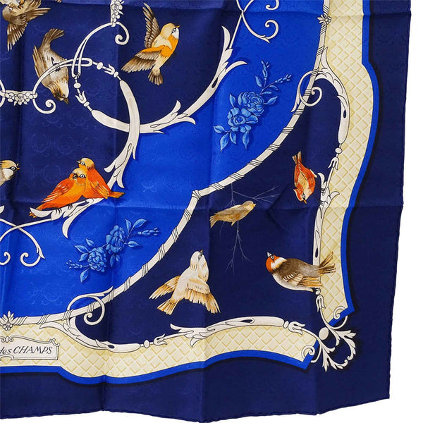 Hermes Hermès LA CLE des CHAMPS Carré 90 Scarf, Women\'s, Silk, Navy Blue, Large, Bird, Flower Design