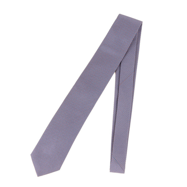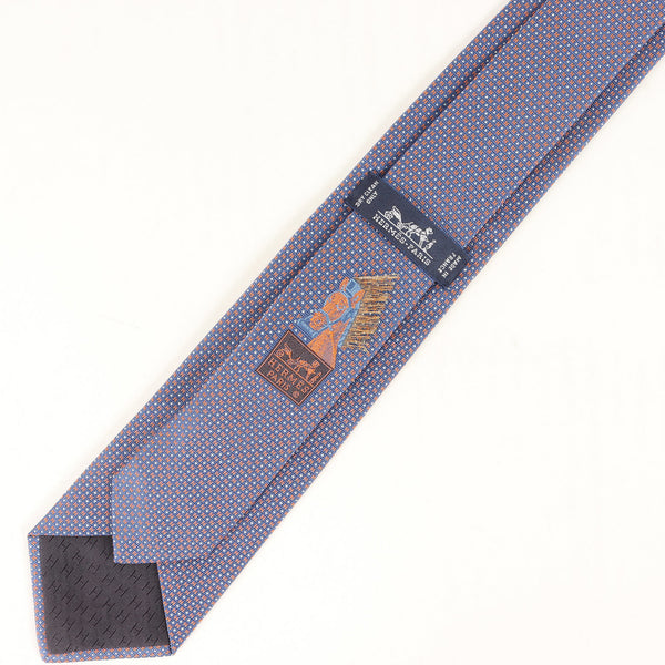 HERMES Mega Chariot H-patterned silk tie (339098T) featuring a three-dimensional horse mane design in navy and orange. Like new. K4615.