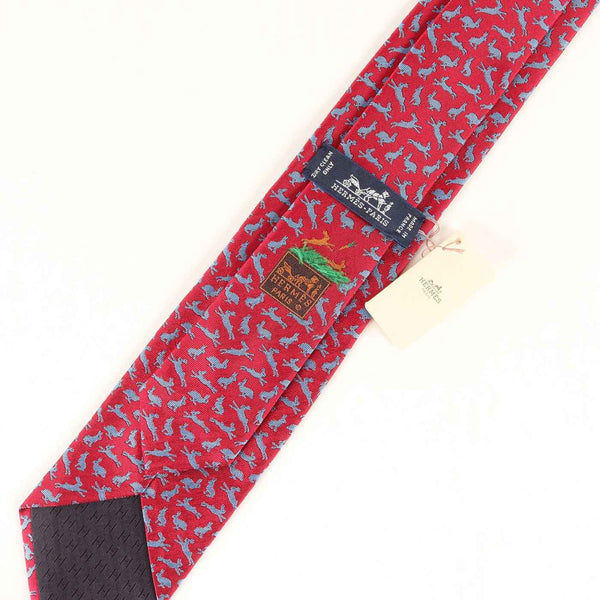 HERMES Rabbit Monogram Silk Tie 339341T 3D Grass Design Red and Light Blue Men\'s Like New K4615