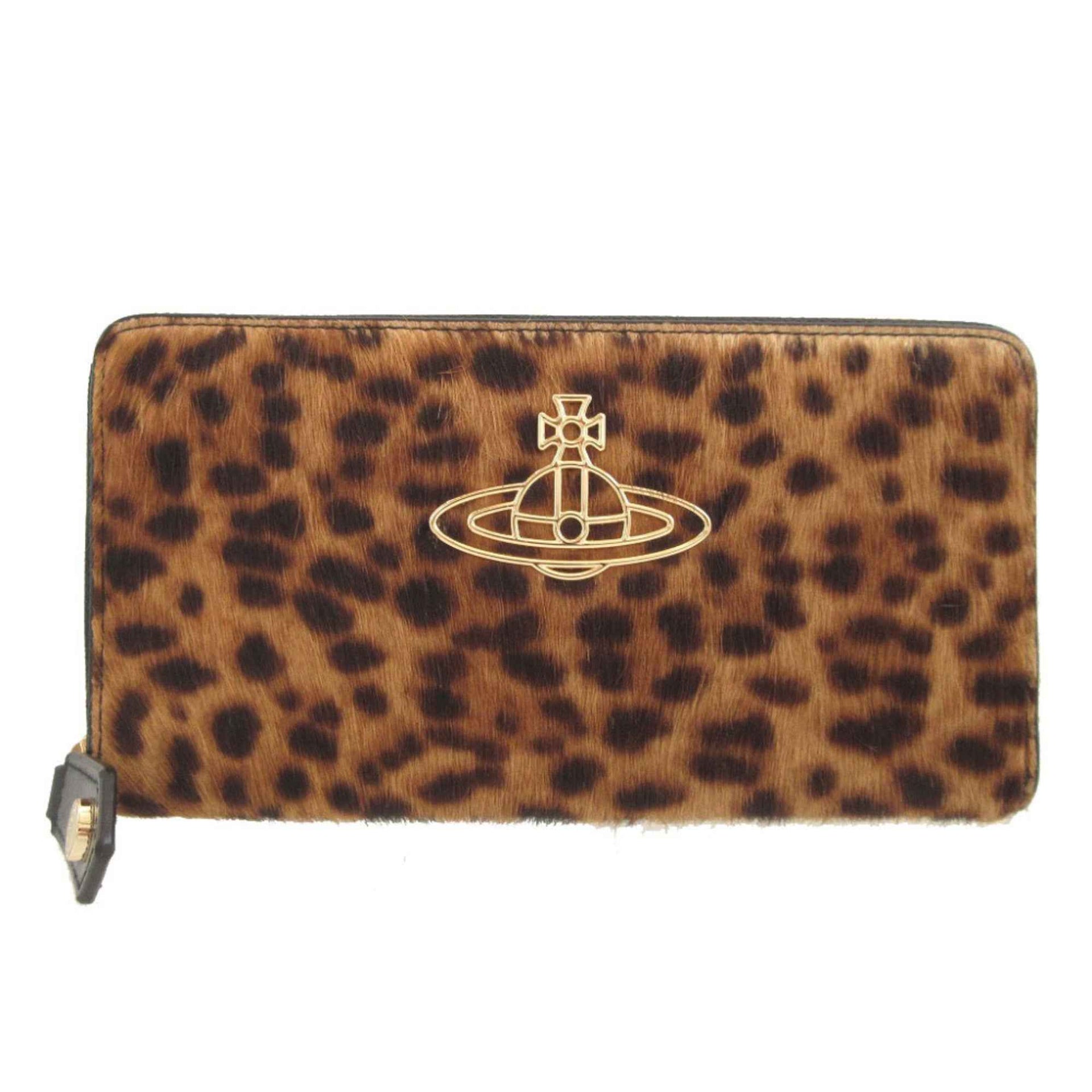 Like new Vivienne Westwood orb patterned brown pony leather round zipper long wallet 1659