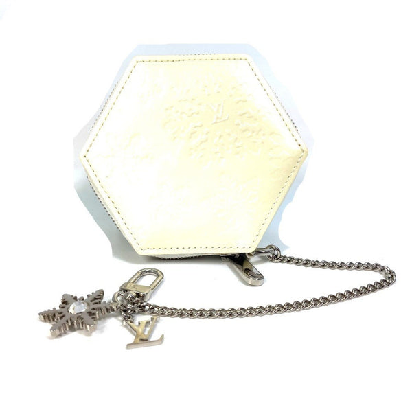 LOUIS VUITTON M58219 Vernis Porte Monnaie Flocon Wallet with Keychain, Coin Purse, Patent Leather, Women\'s, Taupe and White