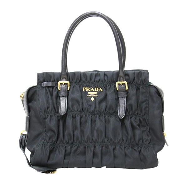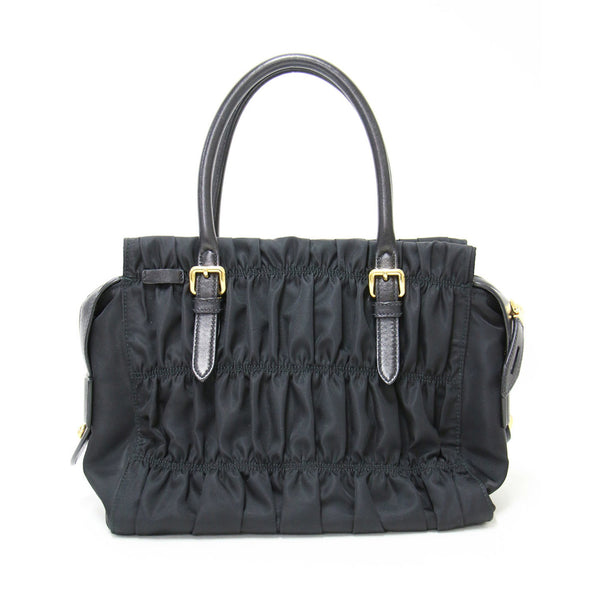 PRADA Prada Nylon Handbag 1BA086 Tote Bag with Gathered Metal and Leather Handles, Black, Women\'s