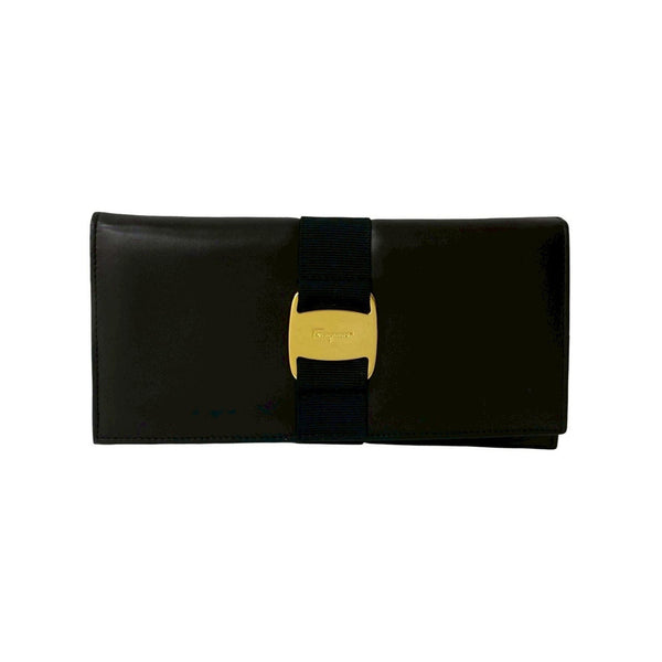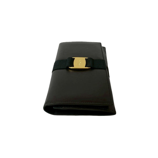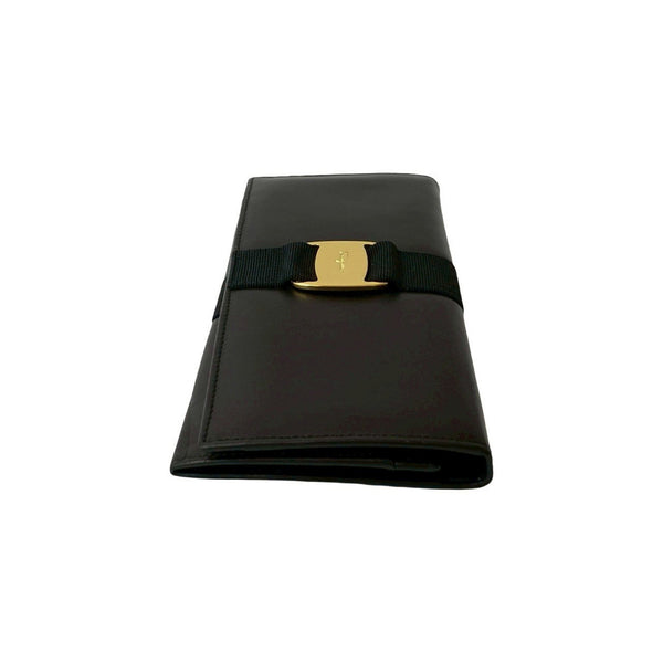 Salvatore Ferragamo Vara Ribbon Logo Metal Hardware Leather Long Wallet Black 37677