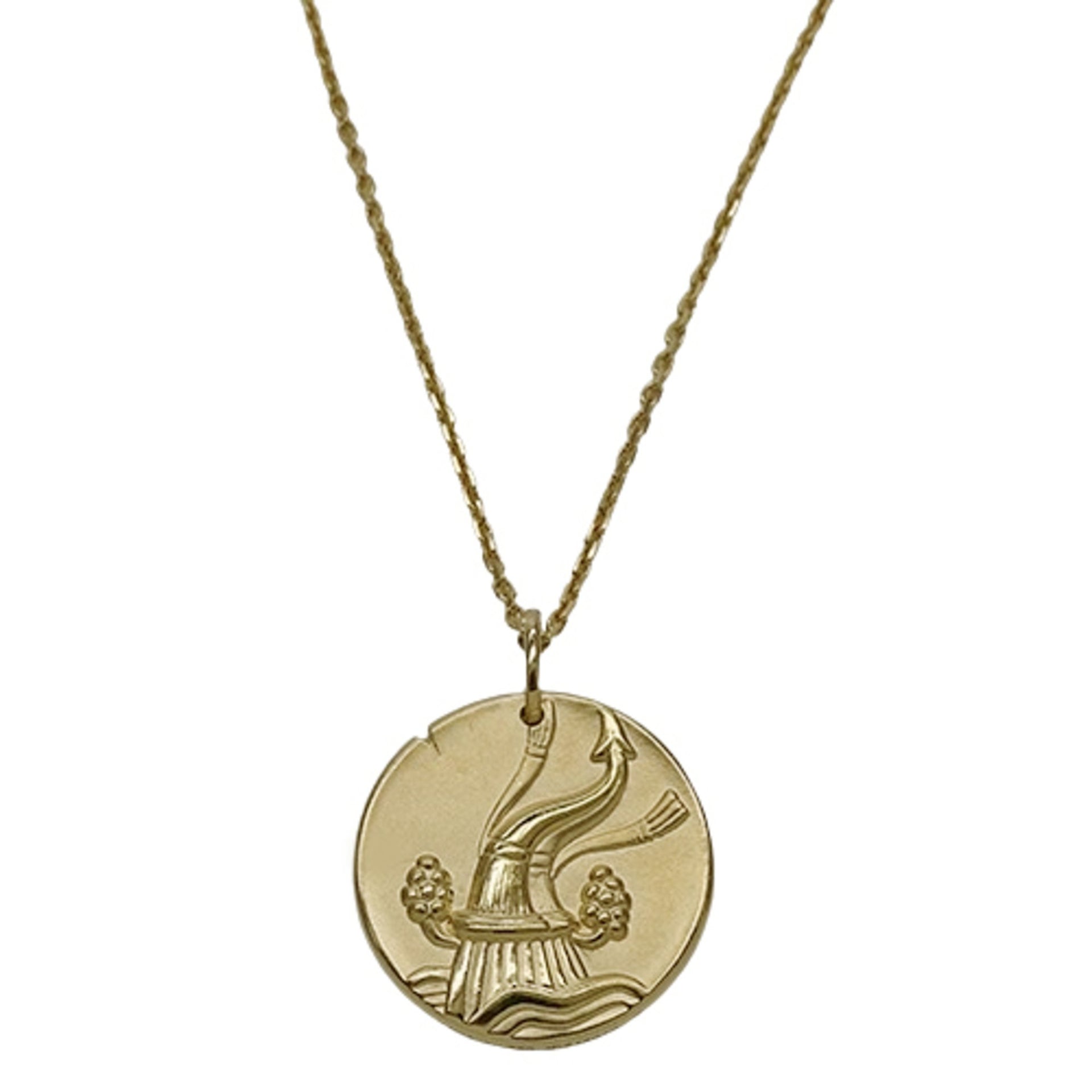 Van Cleef & Arpels women\'s 750YG Zodiac Medal necklace featuring the Aquarius constellation in yellow gold (VCARP7SU00 VCARO3YJ00), polished.